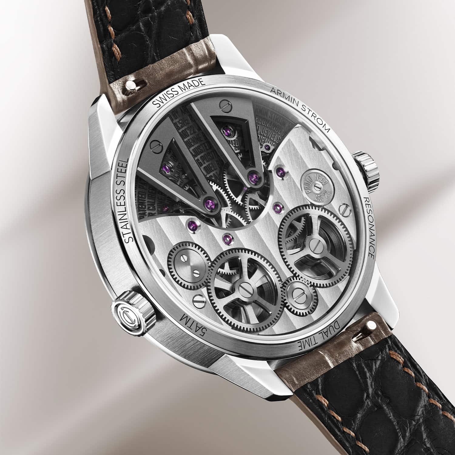 Mặt sau hé lộ bộ máy ARF22 lên dây tay, trang trí Côtes de Genève, với hai lỗ tròn cho thấy hai hộp cót độc lập dự trữ 42 giờ. Trên đó, các cầu anthracite openworked mang đến cái nhìn hiện đại, phô bày cơ chế đối xứng tuyệt đẹp bên dưới.