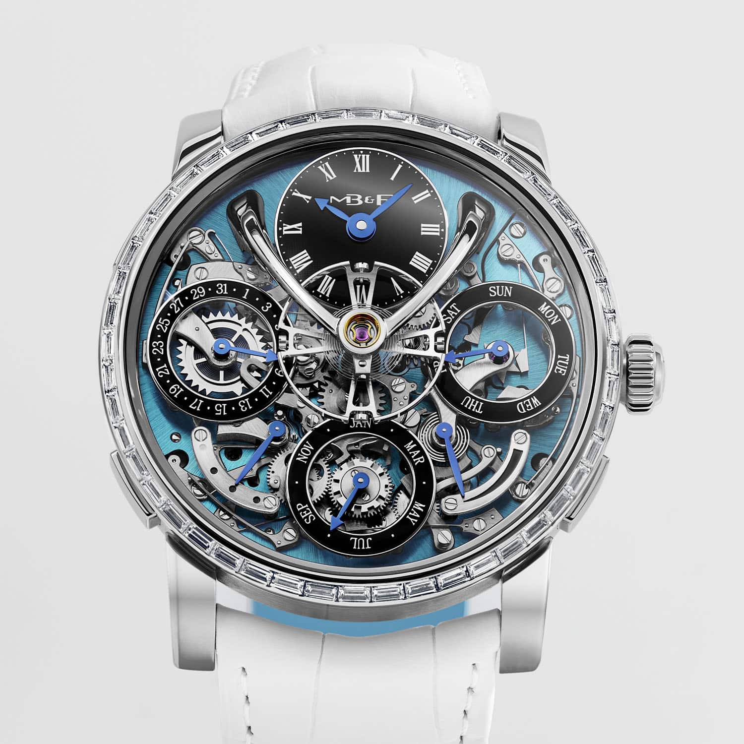 Ra mắt năm 2015, Legacy Machine Perpetual được phát triển cùng nhà chế tác độc lập Stephen McDonnell. Chiếc đồng hồ này tái hiện lịch vạn niên truyền thống với tháng mặc định 28 ngày và một “bộ xử lý cơ học” tự động bổ sung các ngày còn thiếu của từng tháng. Kết quả là một cơ chế vừa trực quan vừa đáng tin cậy, hiển thị giờ, ngày, thứ và tháng trên các mặt số phụ nổi dưới bánh lắc treo lơ lửng. Nhân dịp kỷ niệm này, MB&F trình làng phiên bản thép không gỉ với viền bezel được nạm 48 viên kim cương cắt baguette lần đầu tiên. Mặt số màu ngọc lam tôn lên cấu trúc mở và bánh lắc trung tâm, trong khi các mặt số phụ màu đen với kim xanh giúp tăng khả năng đọc. Giới hạn chỉ 5 chiếc, tuyệt tác này đi kèm dây da cá sấu trắng thủ công và khóa gập thép. Giá bán theo yêu cầu.