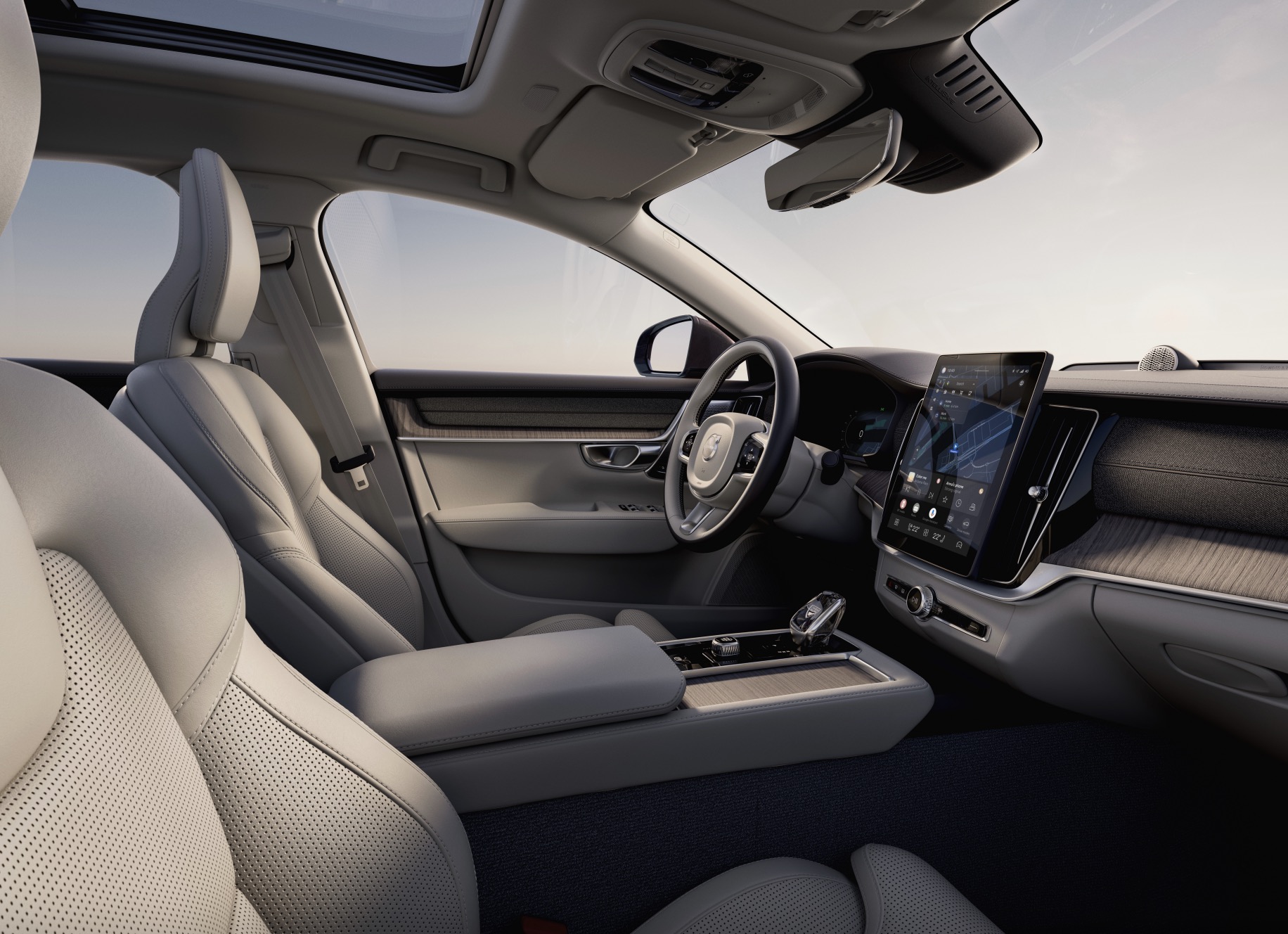 Nội thất của Volvo S90 là biểu tượng của triết lý thiết kế Bắc Âu, kiến tạo nên một chuẩn mực sang trọng mới. Mọi chi tiết đều được sắp đặt hoàn hảo trong tầm nhìn, tạo ra trải nghiệm đa nhiệm liền mạch và thanh lịch. Bảng táp-lô được bọc da vinyl với những chi tiết thủ công tinh xảo, hòa quyện đồng bộ với tấm ốp cửa, mang lại cảm giác thống nhất và đẳng cấp. Điểm nhấn nằm ở các chi tiết ốp gỗ được bố trí theo phương ngang đầy phá cách, kết hợp hài hòa cùng chất liệu vải dệt cao cấp từ 100% polyester tái chế, định hình một đường cong quyến rũ. Khi đêm xuống, hệ thống đèn viền nội thất tinh tế sẽ chiếu sáng bề mặt lõm này, tôn lên kết cấu vân gỗ tuyệt đẹp và tạo nên bầu không khí ấm cúng, thư thái. Bố cục cụm điều khiển, họa tiết lưới loa Bowers & Wilkins, và vô-lăng đều được thiết kế mới, đồng điệu với tinh thần của mẫu XC60.