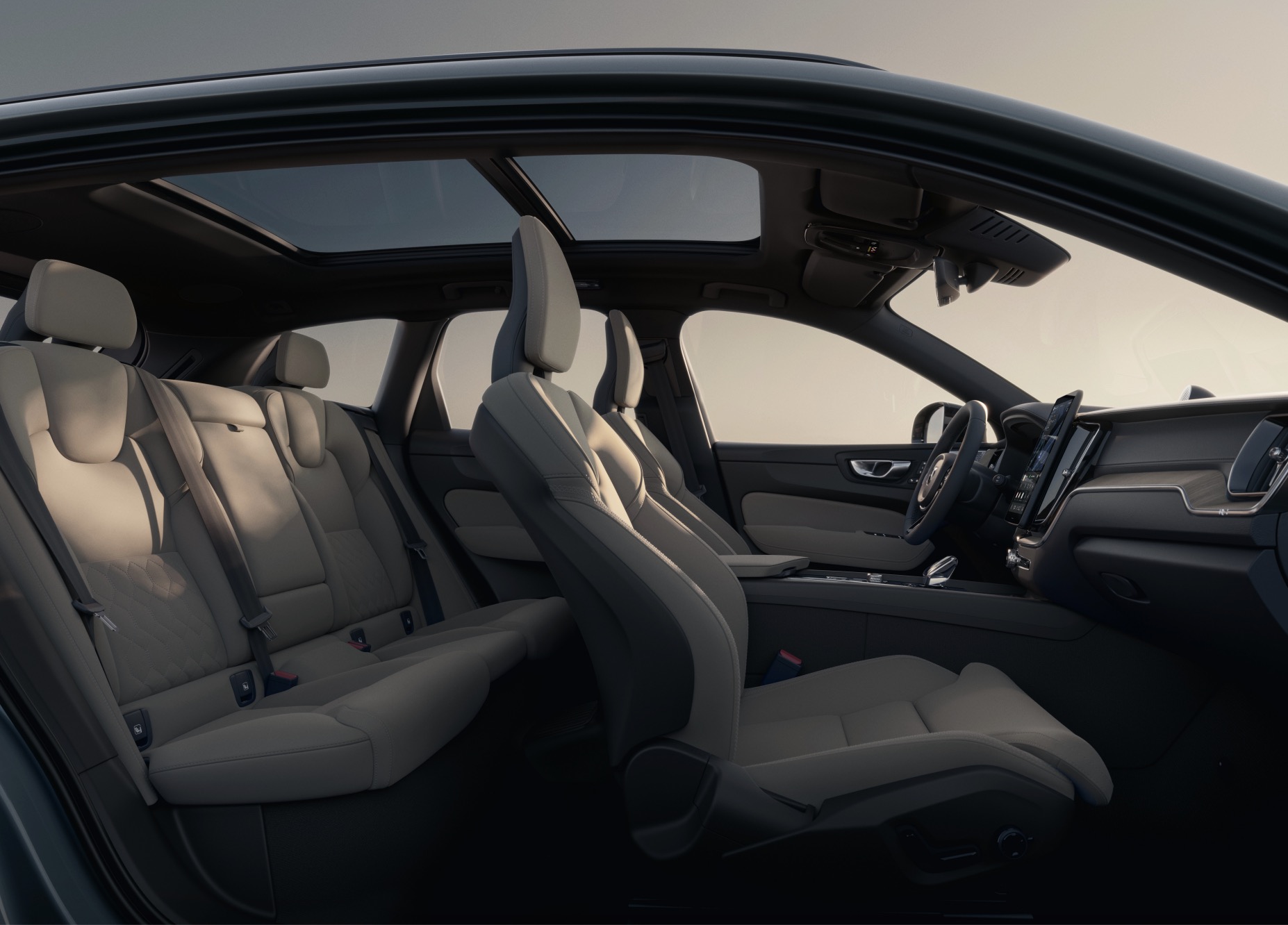 Sự sang trọng của XC60 được cảm nhận qua từng điểm chạm. Các chi tiết ốp trang trí mới từ gỗ tự nhiên, mang hơi thở của thiên nhiên Bắc Âu vào trong không gian xe. Vô-lăng bọc da tổng hợp được hoàn thiện thủ công tỉ mỉ, đi cùng logo mới hiện đại. Volvo XC60 có thêm lựa chọn mới về chất liệu ghế: Quilted Nordico là một loại da tổng hợp, được tạo nên từ vật liệu tái chế có nguồn gốc sinh học tại những khu rừng Thụy Điển và Phần Lan, mang vẻ trang nhã, mềm mại. Trong khi đó, da Nappa vốn có vẫn là một lựa chọn êm ái, dễ chịu cùng hệ thống làm mát tích hợp, hoàn hảo cho những chuyến đi dài.