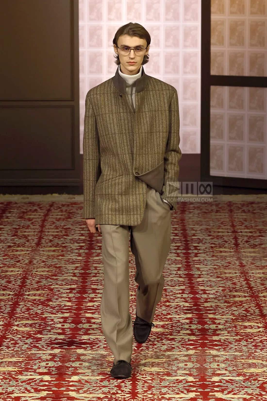 Một trong những xu hướng nổi bật nhất là cách các thương hiệu Ý diễn giải lại phong cách English Country House. Zegna là ví dụ tiêu biểu với những bộ suit mang cảm hứng cổ điển, sử dụng tweed và herringbone, nhưng được nới lỏng phom dáng để phù hợp với đời sống hiện đại. Bảng màu xoay quanh xám, nâu, xanh và kem, tạo cảm giác chững chạc nhưng không cứng nhắc.