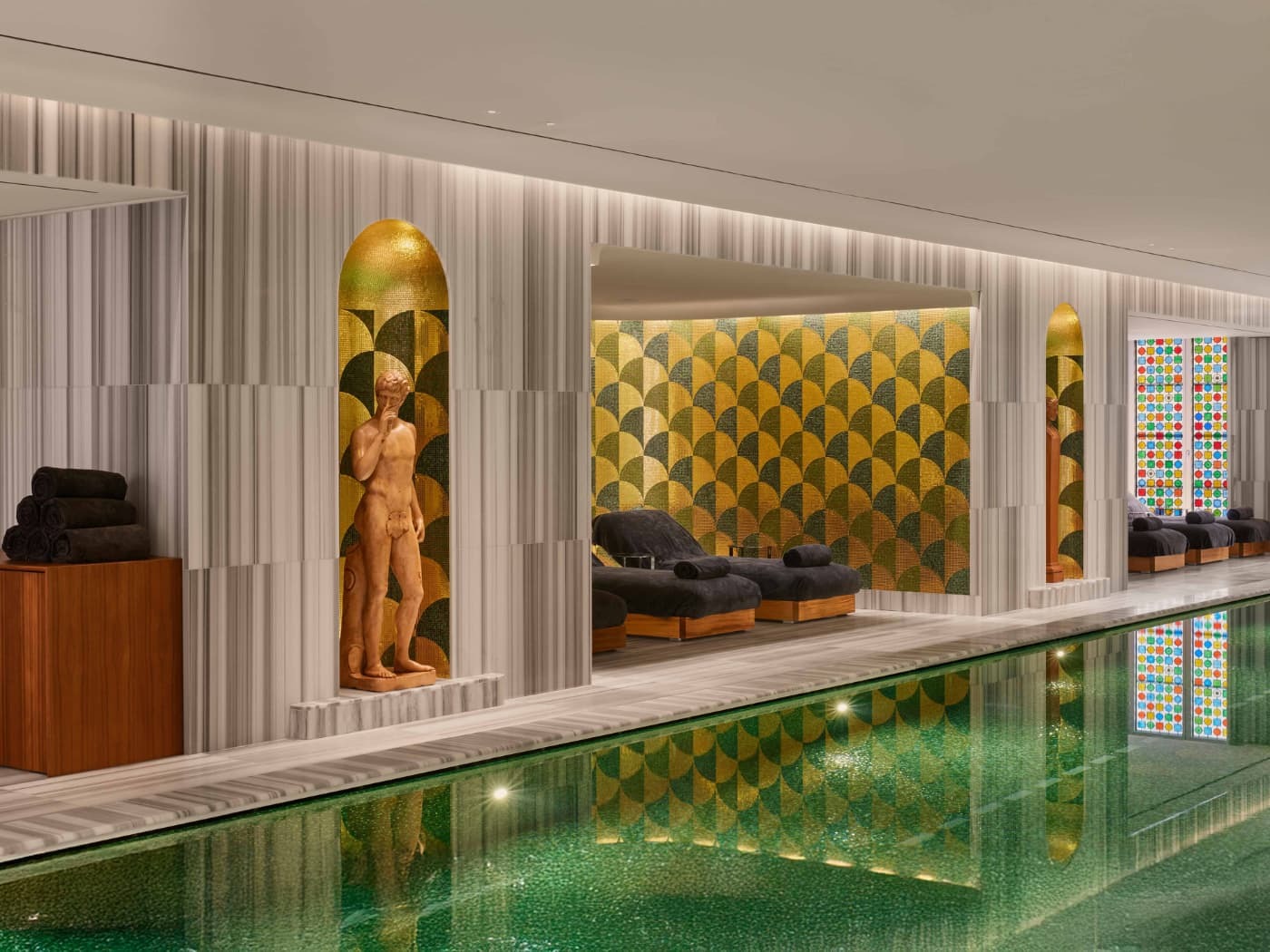 Khu spa của khách sạn được lấy cảm hứng từ văn hóa nhà tắm La Mã cổ đại với hồ bơi dài, ánh sáng phản chiếu trên bề mặt đá và mosaic. Đây là một khoảng lặng hiếm hoi giữa trung tâm thành phố mang đến trải nghiệm được dẫn dắt bằng sự tĩnh tại và nhịp điệu chậm, thay vì những yếu tố trang trí cầu kỳ.