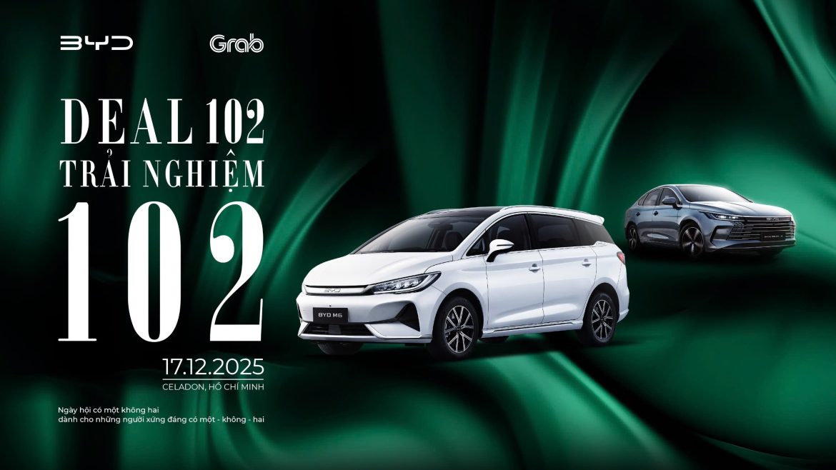 Công ty TNHH Ô tô BYD Việt Nam (BYD Việt Nam) kết hợp cùng Công ty TNHH Grab (Grab) chính thức khai mạc chuỗi sự kiện “BYD – Ngày hội 102” tại Gamuda Celadon Sports & Resort Club vào ngày 17 tháng 12, mở đầu cho hành trình kết hợp giữa BYD, Grab, VPBank, Shinhan Bank và các đối tác sạc EV Power, BitCharge… nhằm mang đến những giá trị thực tế, thiết thực và bền vững cho cộng đồng tài xế công nghệ cũng như khách hàng quan tâm xe năng lượng mới.
