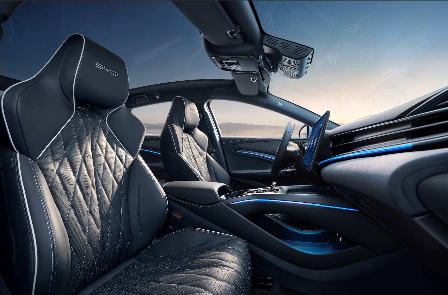 Không gian nội thất BYD HAN thể hiện trọn vẹn tinh thần sang trọng với chất liệu da Nappa cao cấp kết hợp sợi carbon, tạo nên sự cân bằng tinh tế giữa công nghệ và thẩm mỹ. Khu vực điều khiển trung tâm nổi bật với cần số BYD Heart mang tính biểu tượng, màn hình xoay thông minh 15,6 inch và hệ thống đèn viền nội thất 128 màu cho phép tùy chỉnh linh hoạt theo sở thích. Sự sắp xếp hài hòa của các chi tiết mang đến trải nghiệm lái hiện đại, thoải mái và mang dấu ấn cá nhân rõ nét.