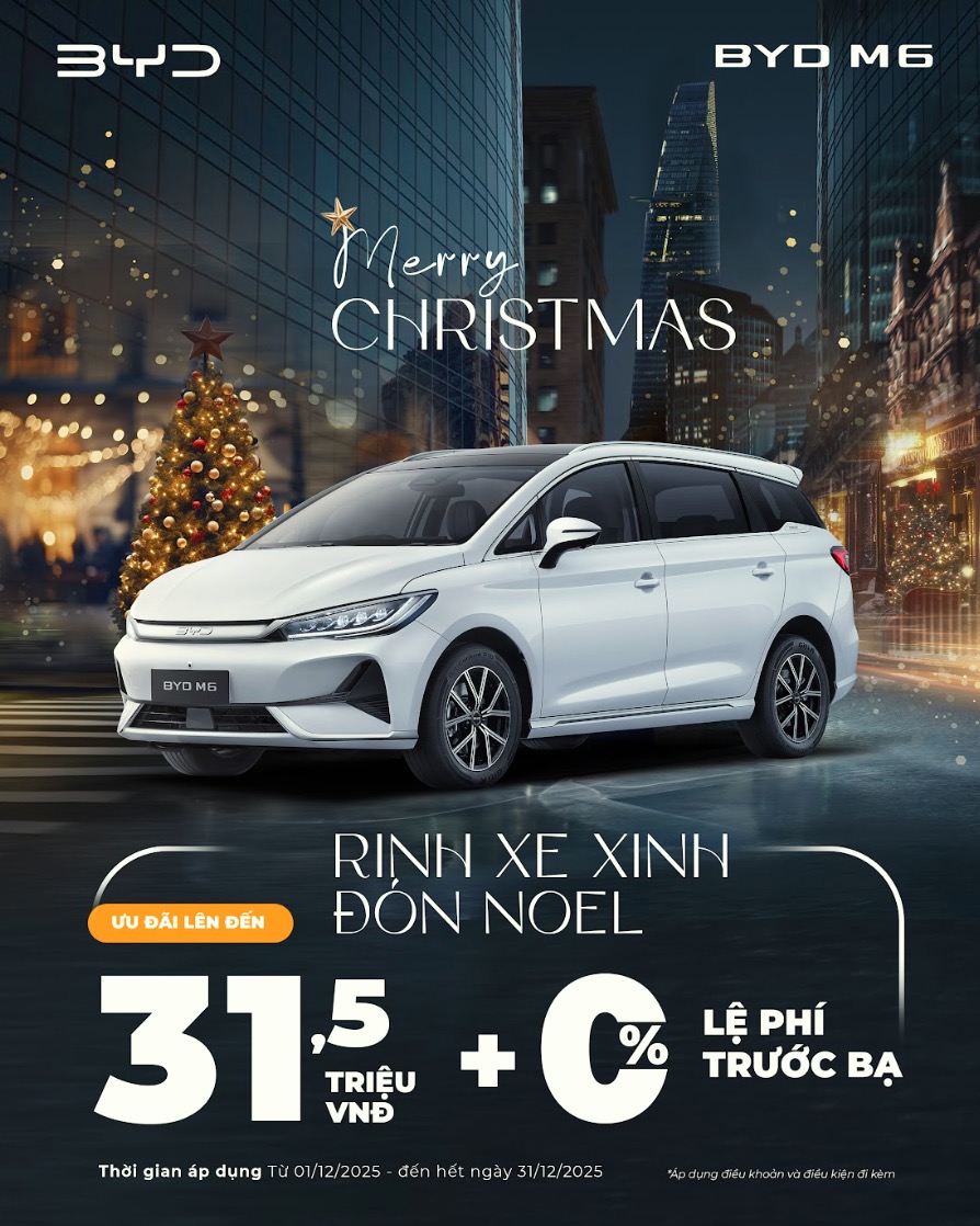 BYD Việt Nam chính thức công bố chương trình ưu đãi đặc biệt tháng 12 mang tên “Rinh Xe Xịn – Đón Noel”, dành cho khách hàng mua xe mới BYD trong thời gian từ 01 tháng 12 đến hết ngày 31 tháng 12 năm 2025 trên toàn hệ thống đại lý ủy quyền.