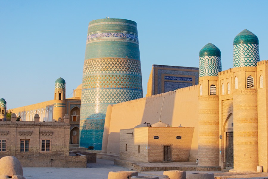 Hai tháp minaret nổi bật trên bầu trời Khiva – Kalta Minor, thấp và chưa hoàn thiện nhưng được phủ gạch xanh ngọc rực rỡ, và Islam Khoja, cao nhất trong thành phố, với những dải gạch xanh, trắng, đỏ và lồng đèn vòm đặc sắc – là biểu tượng sống động của thành phố. Để cảm nhận sự tráng lệ của Khiva, du khách không thể bỏ qua cung điện Tosh Hovli và pháo đài Kuhna Ark ốp hoa văn gạch tinh xảo, hay Nhà thờ Hồi giáo Juma với 200 cột gỗ chạm trổ, một số có niên đại từ thế kỷ thứ 10. Khi ánh hoàng hôn nhuộm vàng Itchan Kala, từ sân thượng Terrasa Café & Restaurant, khung cảnh nơi đây hiện nên như một thước phim đầy mê hoặc và hư ảo.