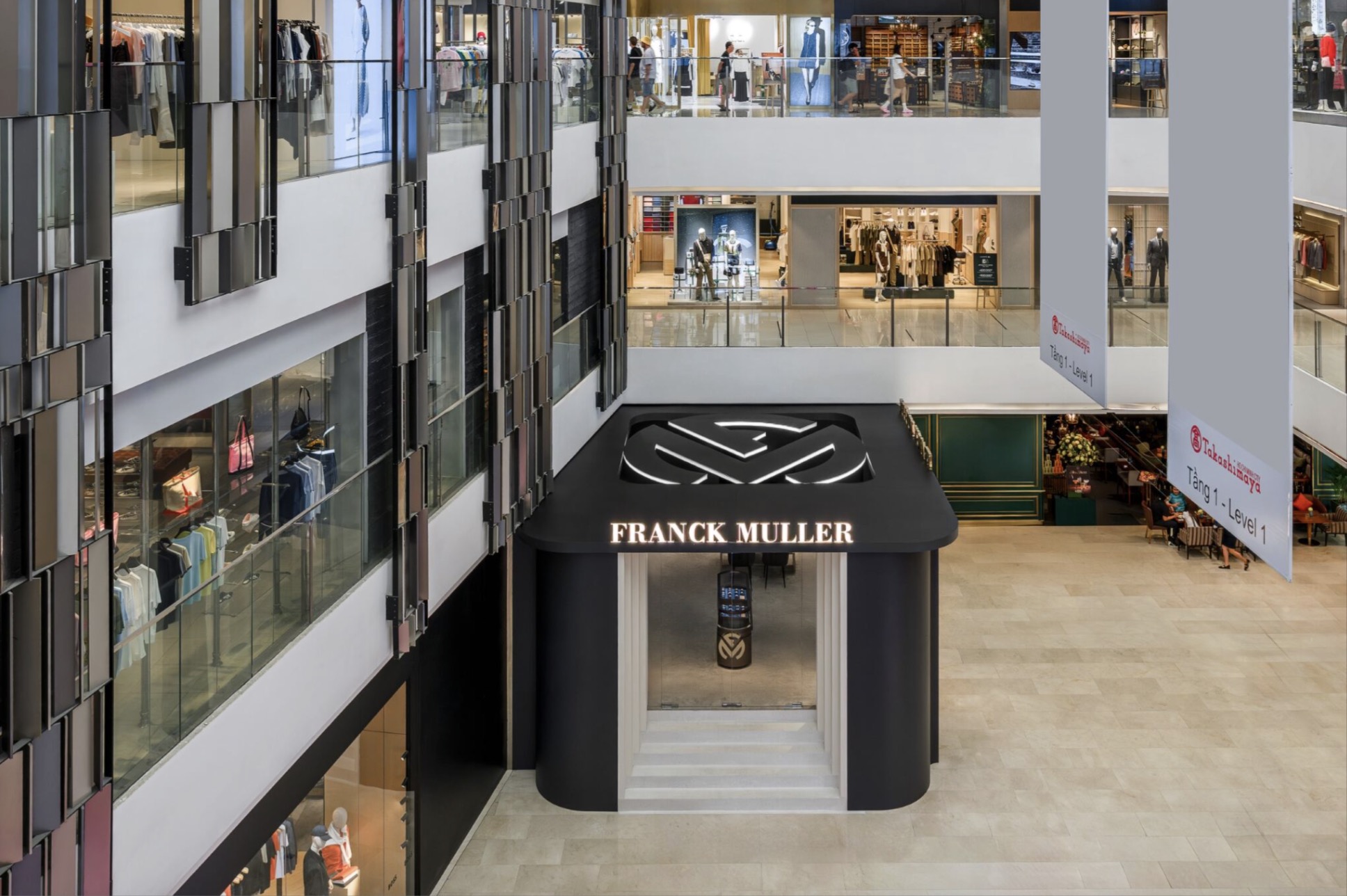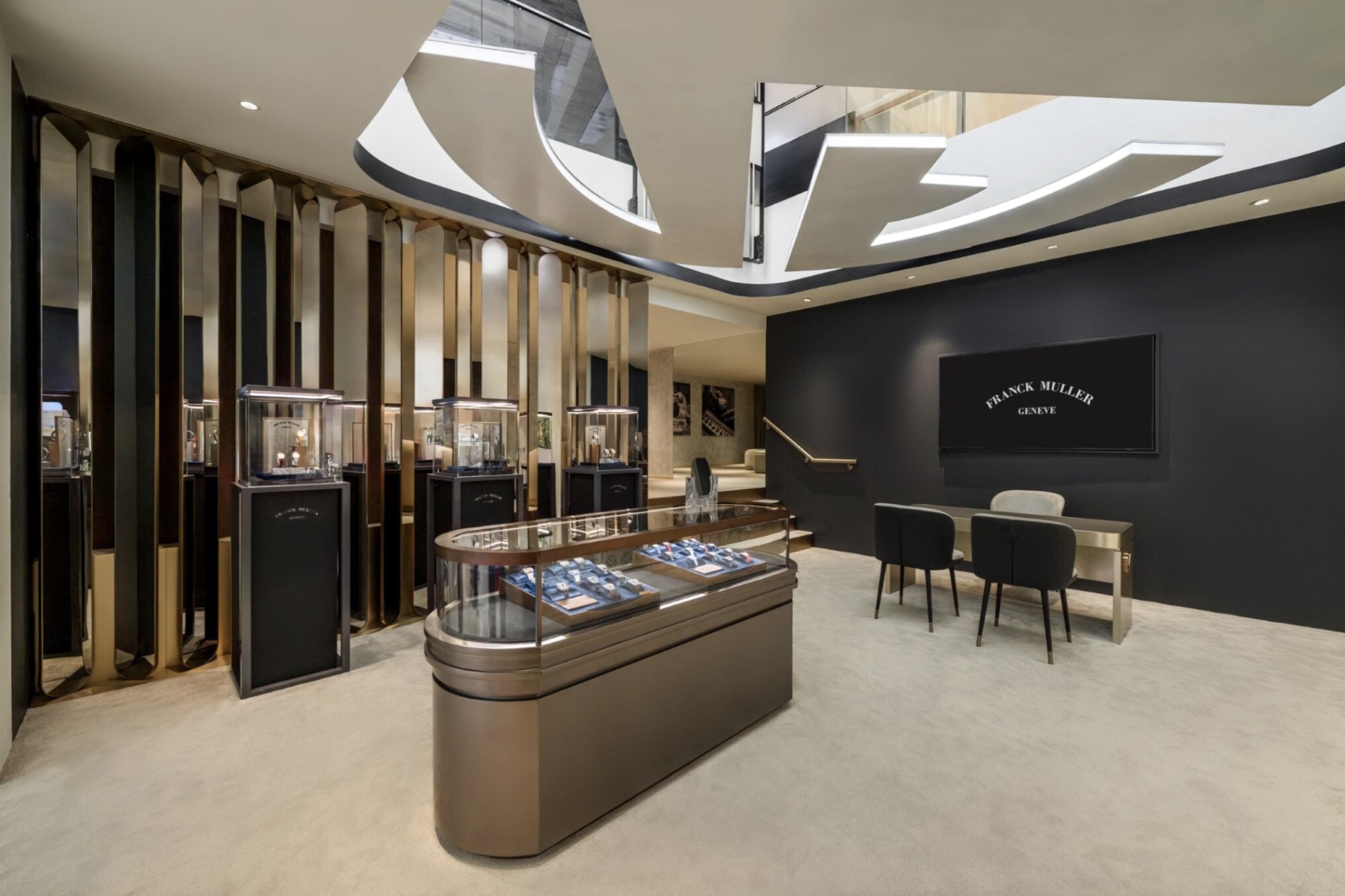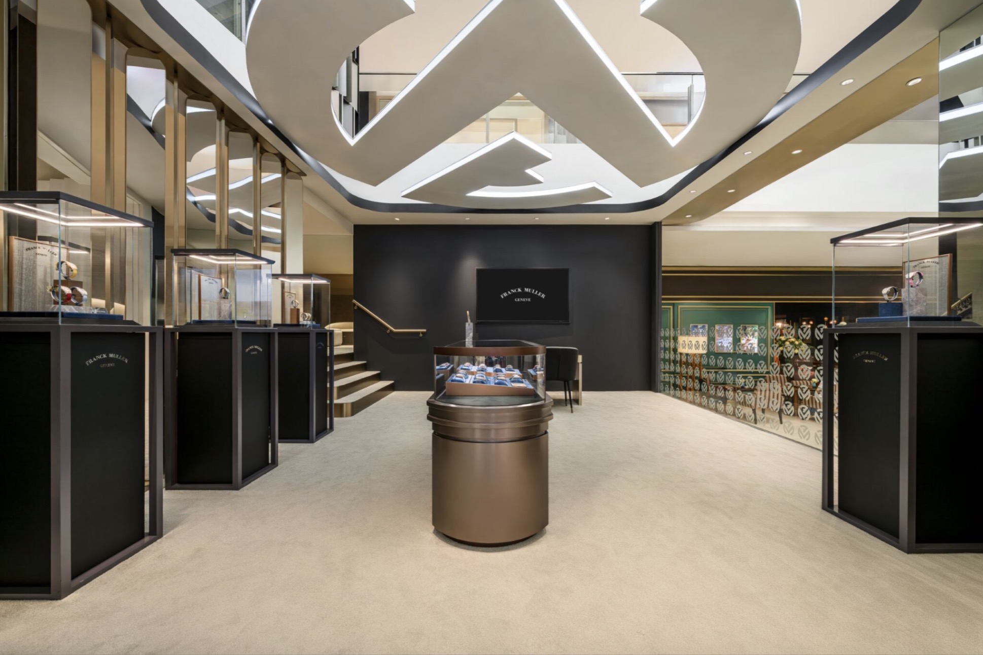Pop-up được thiết kế như một sự mở rộng tinh tế của boutique Franck Muller tại Opera View, không gian pop-up tại Saigon Centre gợi nên không khí của một phòng trưng bày đương đại. Không gian nội thất được bao phủ bởi tông màu trung tính taupe, điểm xuyết sắc vàng champagne sang trọng và màu xanh đặc trưng của Franck Muller, tạo nên sự cân bằng tinh tế giữa nét ấm áp và phong cách hiện đại. Mỗi tuyệt tác đồng hồ được trưng bày như một tác phẩm nghệ thuật thực thụ, thể hiện cam kết của thương hiệu với nghệ thuật và sự tinh xảo trong chế tác.