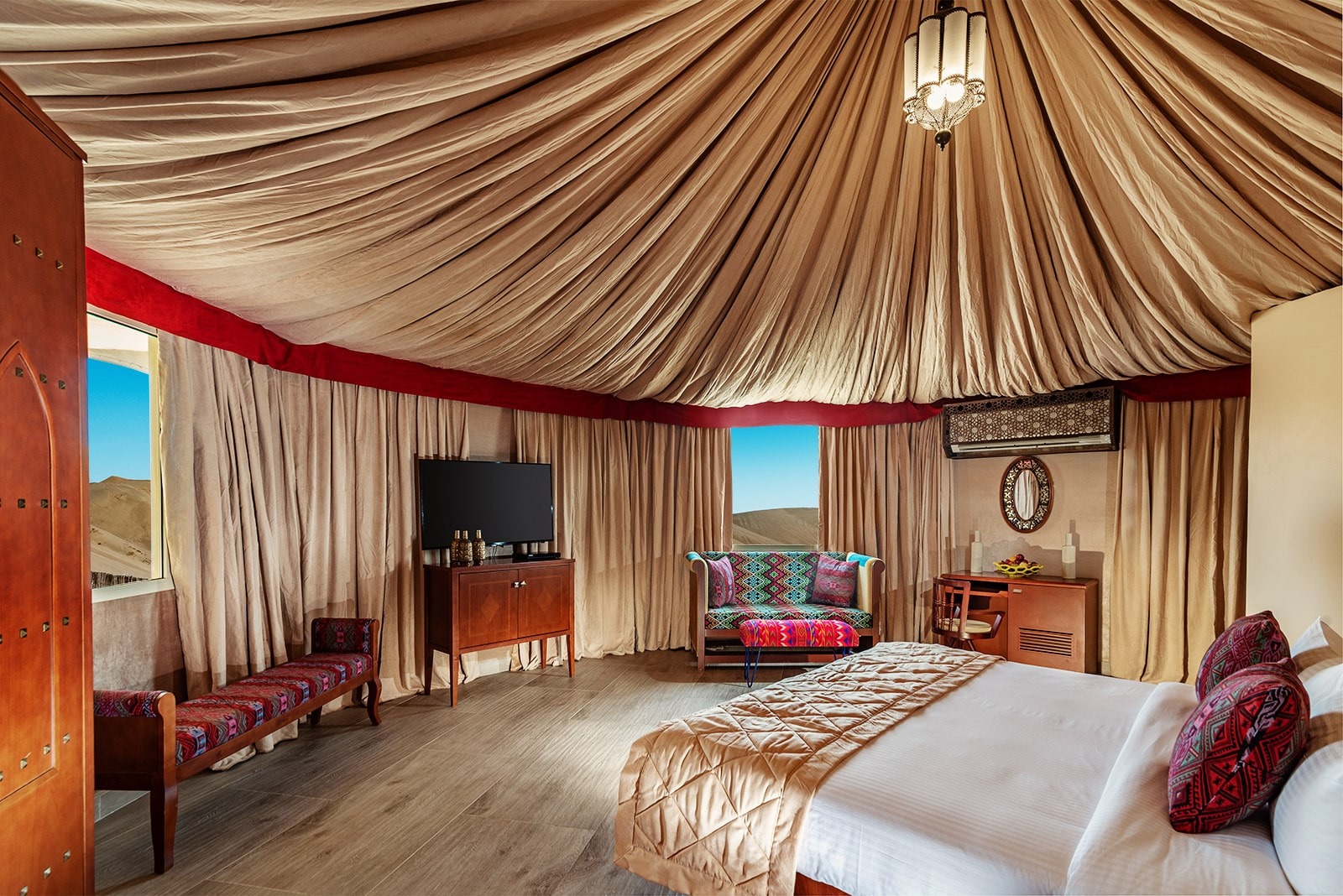 Khu nghỉ dưỡng gồm 30 lều sang trọng, được thiết kế kiên cố, có phòng tắm riêng và không gian tiếp khách kết hợp tiện nghi hiện đại như Wi-Fi và điều hòa. Bên trong, từng chi tiết từ chất liệu vải mềm mại đến sắc màu đậm chất bản địa đều được cân nhắc sử dụng để mang đến sự ấm cúng, đồng thời mở ra khung cảnh sa mạc ngoạn mục qua ô cửa sổ rộng. Khi ánh hoàng hôn nhuộm vàng từng đụn cát, khung cửa trở thành bức tranh sống động để du khách chiêm ngưỡng ánh sáng và bóng tối nhảy múa trên nền cát mịn.