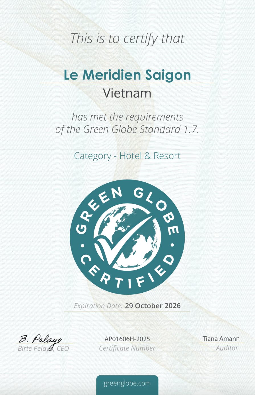 Chứng nhận Green Globe đánh giá các tiêu chí về môi trường, xã hội và kinh tế, xác nhận rằng khách sạn Le Méridien Saigon đang hoạt động theo những tiêu chuẩn cao nhất trong việc bảo vệ môi trường và nâng cao chất lượng cuộc sống cho cộng đồng.