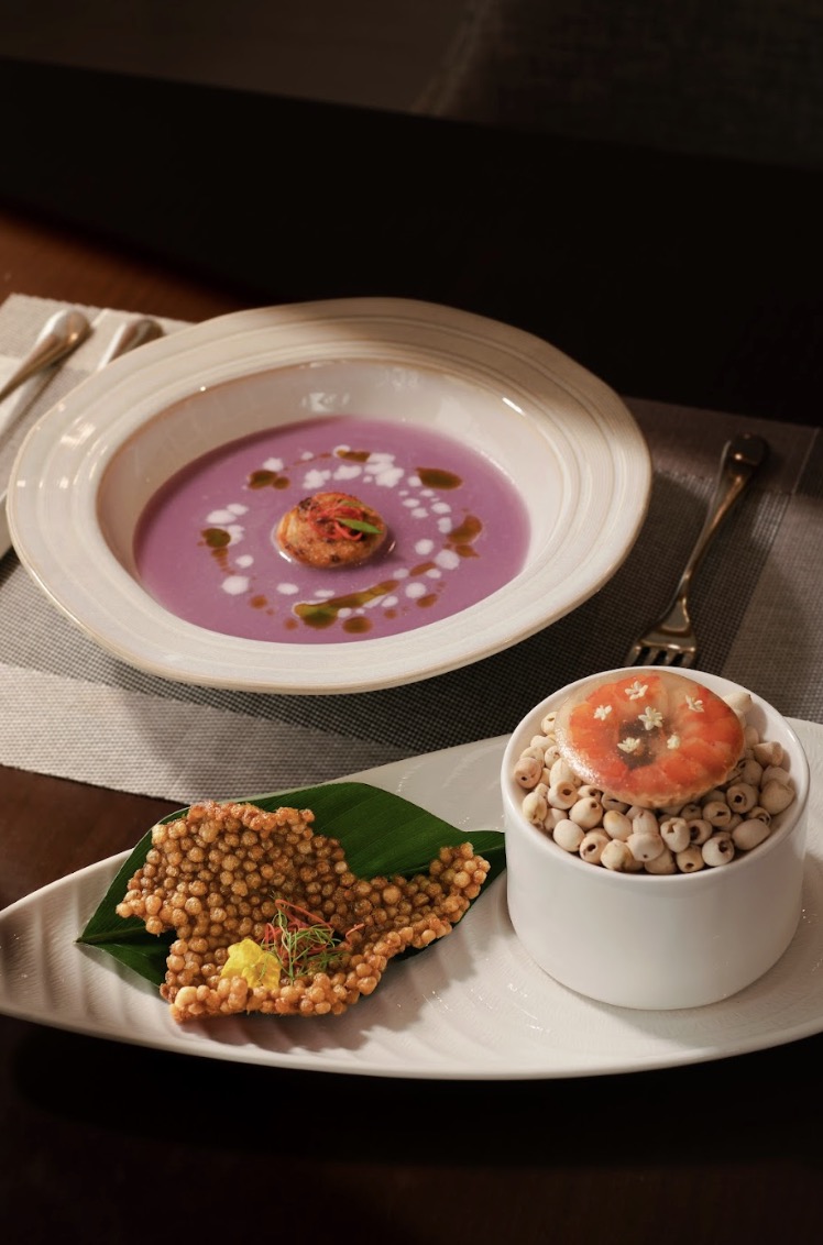 Hành trình ẩm thực mở đầu với Bánh Mì Cá Trích đến từ Chef Nguyễn Hải Hưng của Sheraton Phu Quoc Long Beach Resort, một sự kết hợp mộc mạc nhưng đầy sáng tạo giữa cá trích Phú Quốc và xíu mại nấu cùng xốt tiêu xanh đậm đà. Chef Hưng đã khéo léo biến tấu món ăn, đưa những hương vị quen thuộc được nâng tầm tinh tế, đồng thời thể hiện trọn vẹn tinh thần bền vững thông qua việc tận dụng triệt để nguyên liệu. Tiếp theo, Chef Nguyễn Văn Yêu đến từ Sheraton Hai Phong mang đến Bánh Cua & Súp Khoai Mỡ, lấy cảm hứng từ bát cháo khoai trong ký ức tuổi thơ của anh. Từ nguyên liệu cua tươi Hải Phòng, anh tạo nên miếng chả cua mềm mọng, phủ lớp bánh phồng cua giòn tan, dùng kèm súp khoai mỡ tím mịn màng thơm mùi dầu lá Mần Tưới – tất cả mang đến một hương vị hài hòa vị ngọt của biển và sự an yên của miền quê Bắc Bộ.