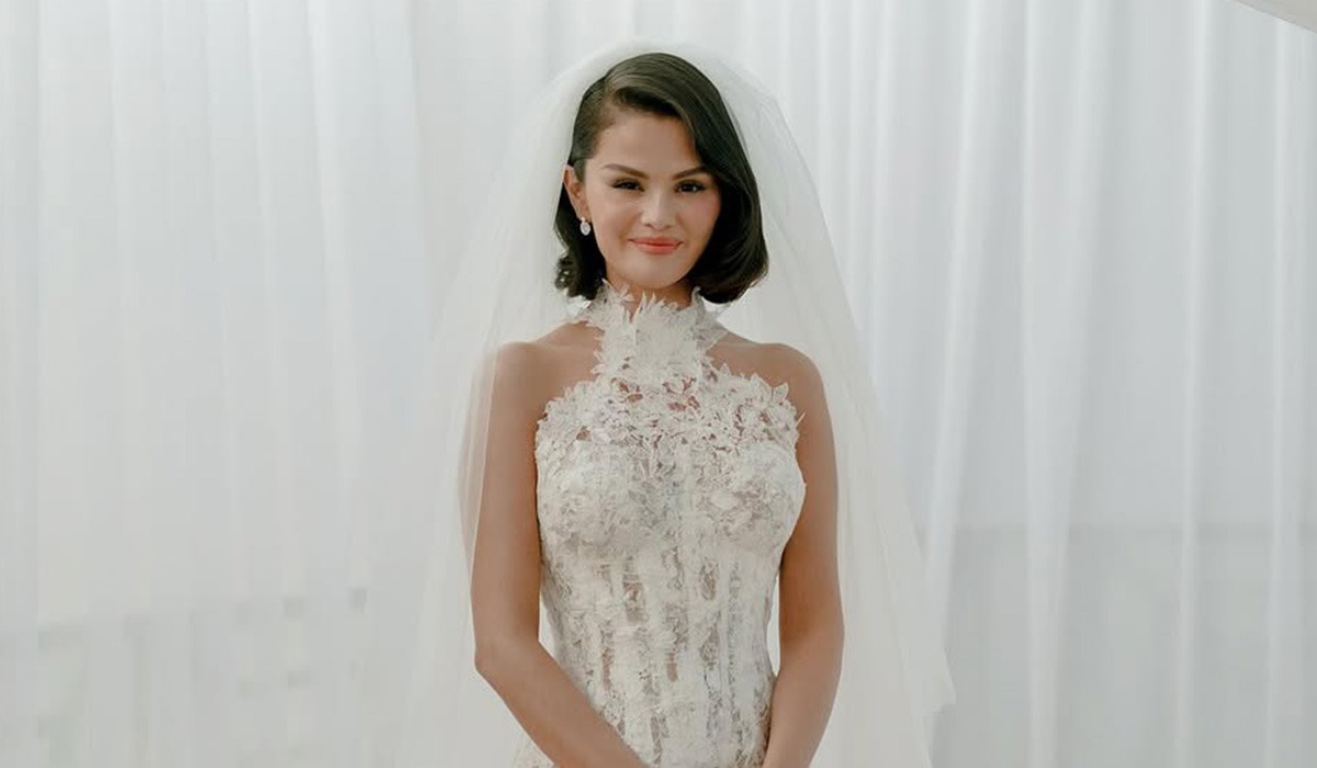 Sự xuất hiện đáng mong chờ nhất đã đến khi cô dâu Selena bước ra trong chiếc váy cưới satin trắng của Ralph Lauren, tinh khôi và mềm mại. Ba trăm bông hoa ren thêu tay tượng trưng cho 300 ngày đầu tiên họ ở bên nhau. Bên trong lớp lót, một trái tim nhỏ với hai chữ cái “S” và “B” được giấu kín – bí mật chỉ cô và nhà thiết kế biết. Cô không đội vương miện, không đeo trang sức phô trương, chỉ chọn đôi khuyên tai kim cương platinum của Tiffany & Co., vừa đủ để ánh lên nét rạng ngời của sự giản đơn.
