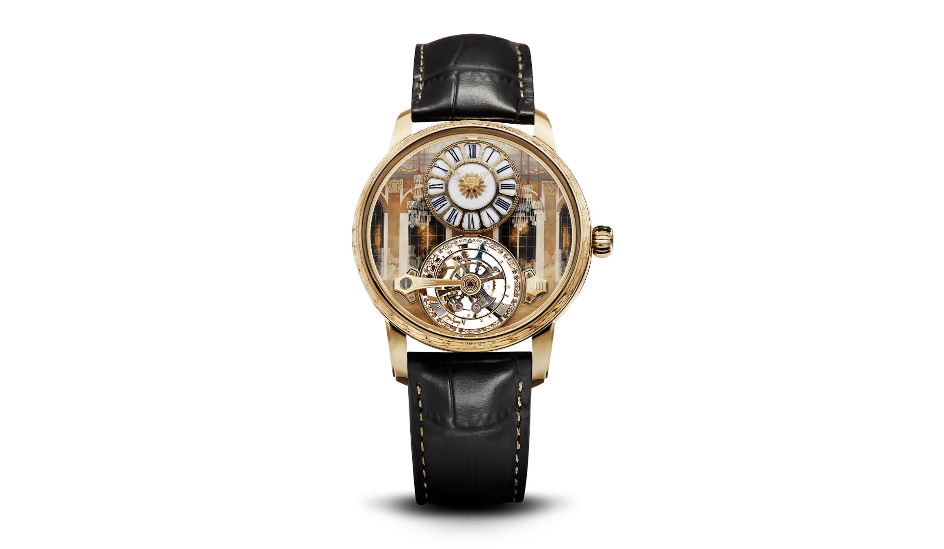 Montblanc tôn vinh vẻ đẹp tráng lệ của cung điện Versailles và buổi dạ vũ huyền thoại nhất trong lịch sử cung đình qua Bộ sưu tập Star Legacy Suspended Exo Tourbillon Château de Versailles. Mỗi chi tiết bên trong tuyệt tác này được lấy cảm hứng trực tiếp từ Versailles, với mặt số tái hiện lại hình ảnh Đại sảnh Gương trong đêm diễn ra buổi dạ tiệc “The Yew Tree Ball”. Đó là một kỳ công của nghệ thuật trang trí, kết hợp kỹ thuật tráng men truyền thống, hội họa thu nhỏ và khảm đá cẩm thạch cùng gỗ sồi. Đường nét thiết kế có phần đương đại hơn, không kém phần tinh xảo, chiếc đồng hồ được ứng dụng công nghệ mô hình 3D tiên tiến và khắc laser trên nền sapphire và đồng thau.