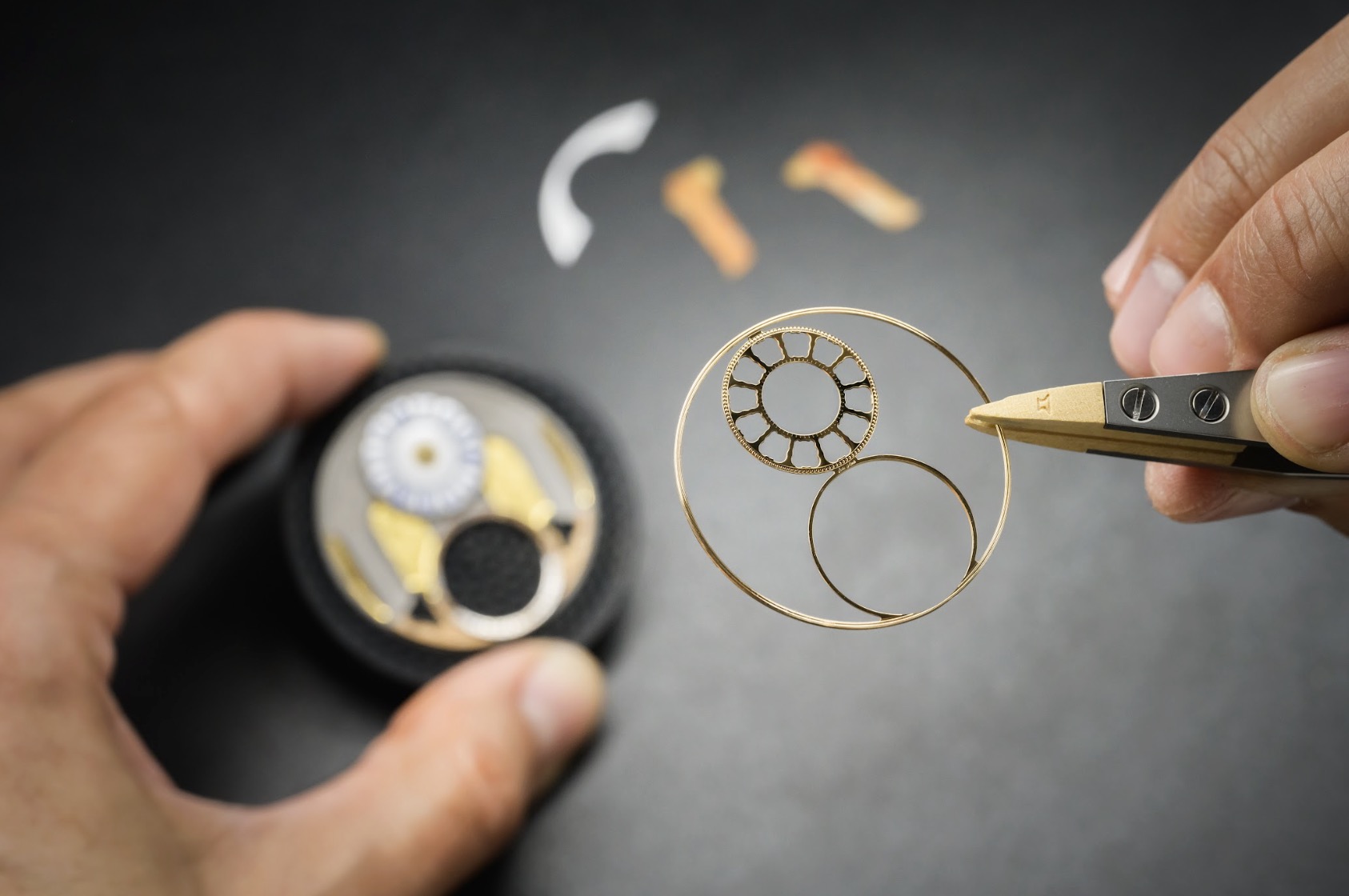 Phần đế của mặt số được chế tác từ vàng trắng 18K (750/1000), và hoàn thiện bằng lớp phủ men màu đen và được điểm xuyết bằng những mảnh vàng nhỏ trước khi được nung trong lò. Sự kết hợp giữa men và vàng tạo nên hiệu ứng phản chiếu của những chùm đèn pha lê lấp lánh ánh nến, mang đến chiều sâu cuốn hút cho toàn bộ mặt số. Các vòm đá được tạo tác từ hai loại đá quý: đá Cacholong trắng sữa – loại đá thuộc dòng opal, và đá cẩm thạch Sarrancolin được khai thác từ cùng mỏ đá tại vùng Hautes-Pyrénées ở Pháp, đây cũng là địa điểm từng cung cấp cẩm thạch cho Đại sảnh Gương ở Versailles. Ở chi tiết phần sàn được chế tác từ gỗ sồi nguyên khối, cắt và khảm thủ công để tái hiện họa tiết sàn gỗ parquet đặc trưng của Versailles.