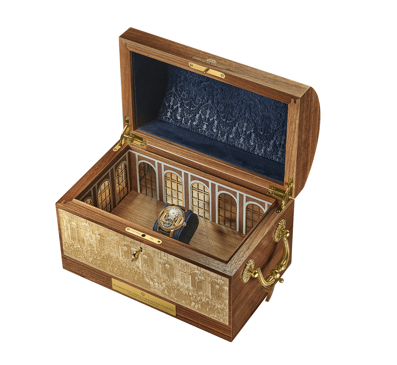 Chiếc hộp đựng Montblanc Star Legacy Suspended Exo Tourbillon Château de Versailles được chế tác bởi thương hiệu chế tác đồ gỗ xa xỉ của Paris – Elie Bleu, thành lập từ năm 1976. Bên trong là hộp nhạc do ông Reuge đảm nhiệm – nhà chế tác Thuỵ Sĩ chuyên về hộp nhạc cao cấp và chế tác chim hót cơ học từ năm 1865. Bản nhạc được lựa chọn chính là khúc nhạc vang lên tại Versailles trong lễ cưới của Thái tử Louis và cô dâu, vào đêm hội huyền thoại tháng Hai năm 1745. Tác phẩm do Jean-Philippe Rameau sáng tác, với phần lời của “biểu tượng văn chương nước Pháp” Voltaire.