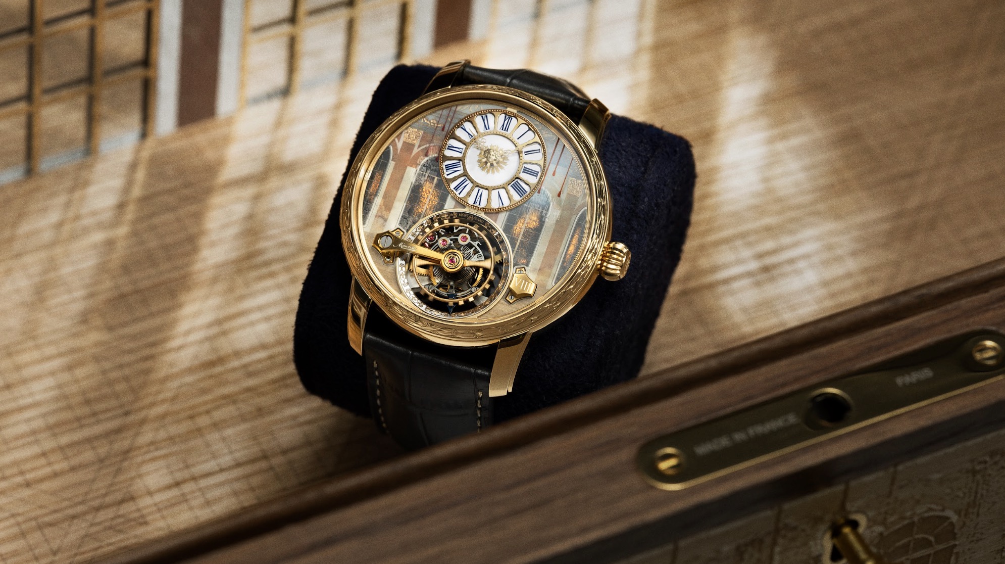 Kỹ thuật này tạo nên nền trắng ánh sáng cho mặt số hiển thị thời gian, trong khi men xanh được dùng để vẽ các chữ số La Mã cùng lớp phủ bột vàng nguyên chất tái hiện những tia nắng tỏa rạng từ tâm mặt trời ở trung tâm. Phía trên mặt số, một vòng đỡ bằng vàng 3N được gia công laser được đặt khéo léo, tạo nên khung viền trang trí mô phỏng chi tiết đồng thau đánh bóng trong Đại sảnh Gương của Versailles. Khu vực bao quanh tourbillon tái hiện họa tiết kính màu, trong đó có biểu tượng fleur-de lys – là dấu ấn hoàng gia xuất hiện khắp Nhà nguyện Hoàng gia Versailles.