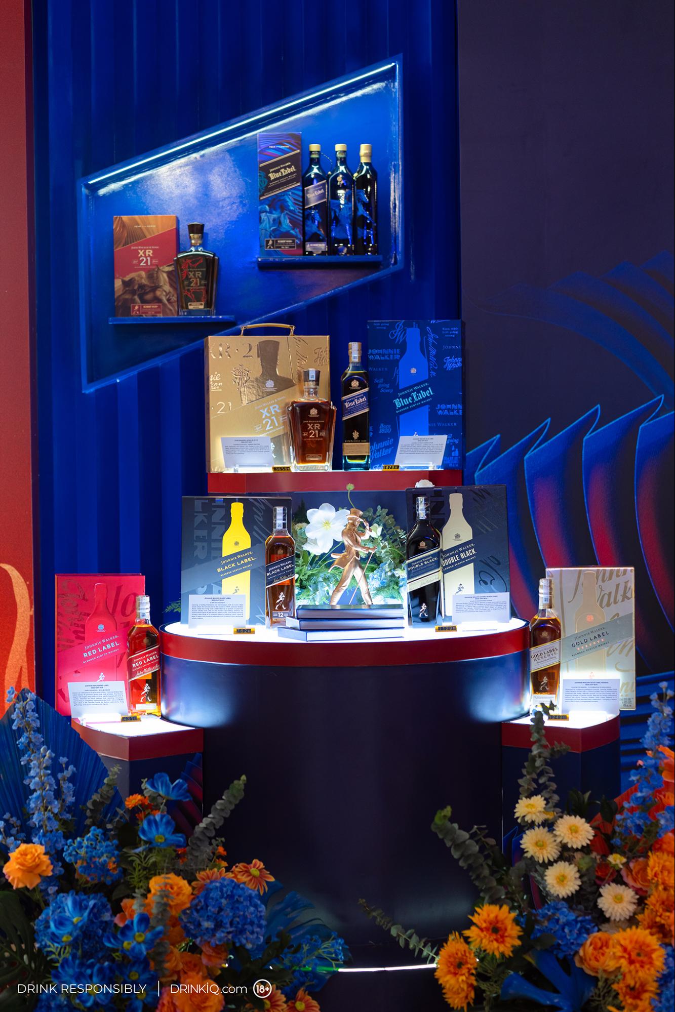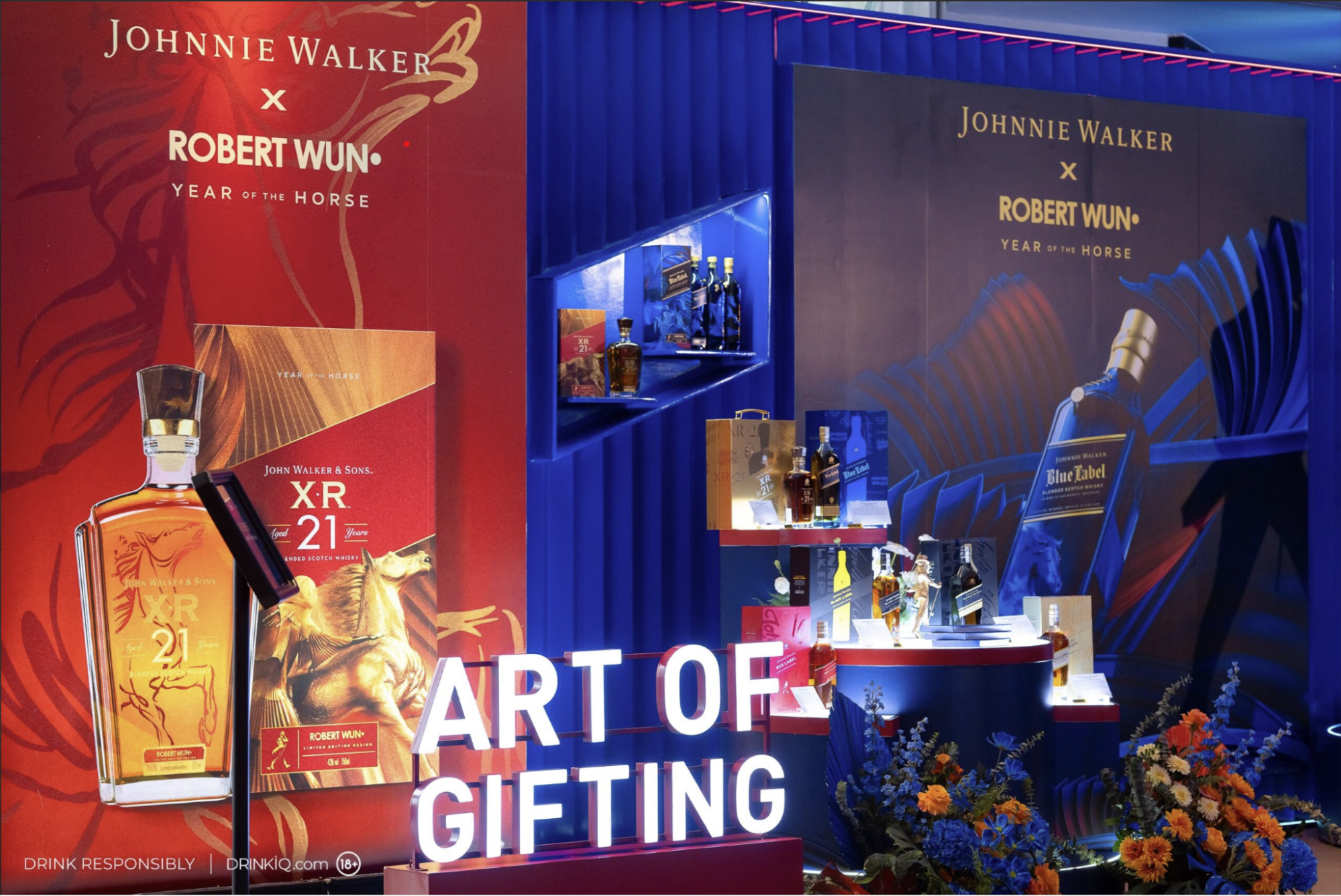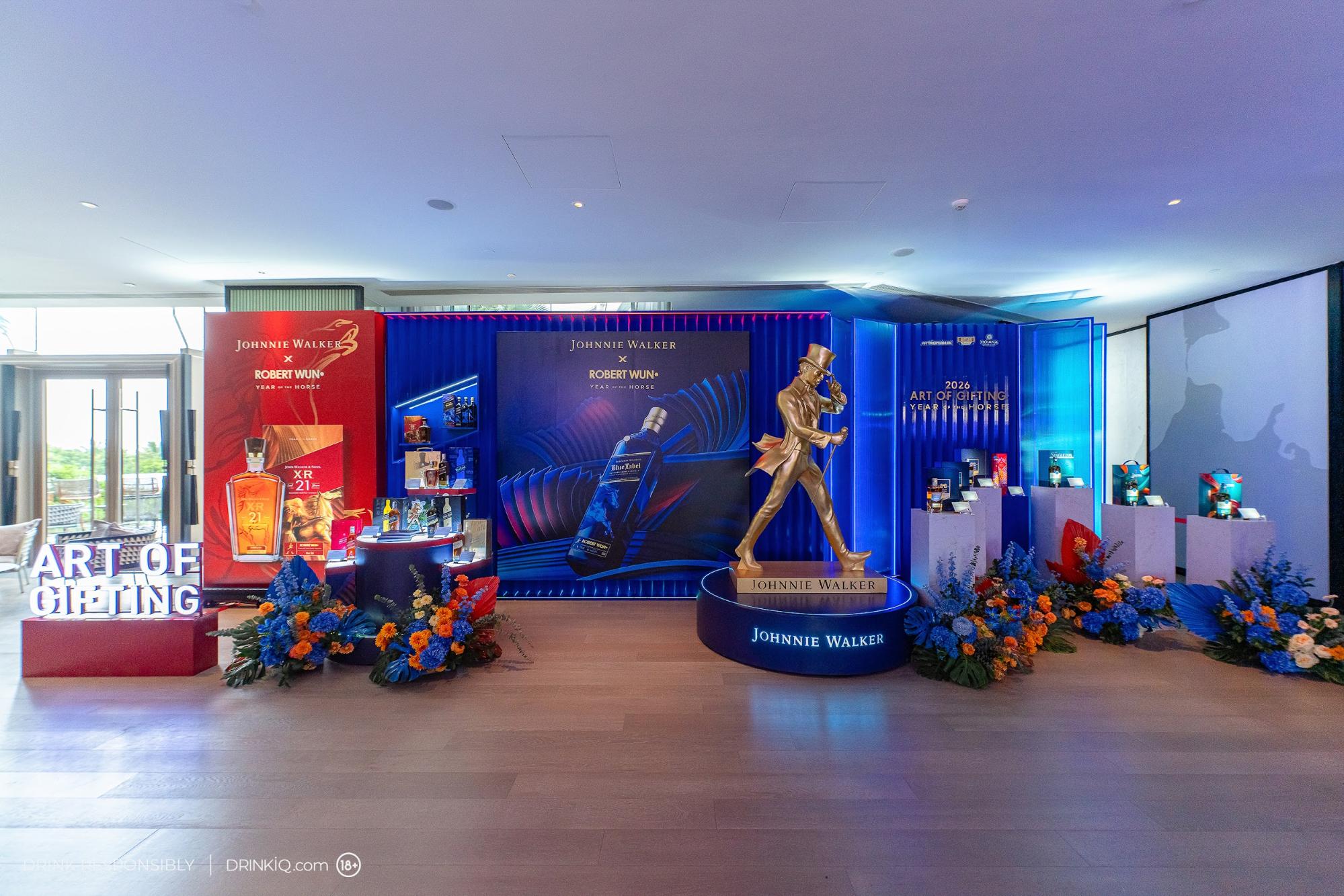 Những tặng phẩm của nhà Johnnie Walker cho năm 2026 được bày trí bắt mắt cùng bộ sưu tập chính từ Robert Wun.