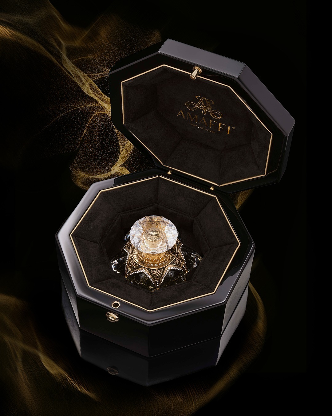 Nhìn một lọ nước hoa AMAFFI, người ta không thấy sản phẩm thương mại mà thấy một tác phẩm điêu khắc. Từng thân chai được thổi từ pha lê, mạ vàng 24K hoặc nạm bạc, nắp chai khắc hoa văn cầu kỳ và phần đế tựa như ngai vàng thu nhỏ. Mọi chi tiết đều được làm thủ công tại Pháp và Thụy Sỹ – nơi bàn tay của những nghệ nhân lão luyện khắc họa niềm kiêu hãnh vào từng đường nét. Khi chạm vào một chai AMAFFI, ta không chỉ cảm nhận trọng lượng của thủy tinh và kim loại quý, mà còn nghe được hơi thở của sự nghiêm cẩn và lòng tự tôn ẩn trong từng giọt hương.