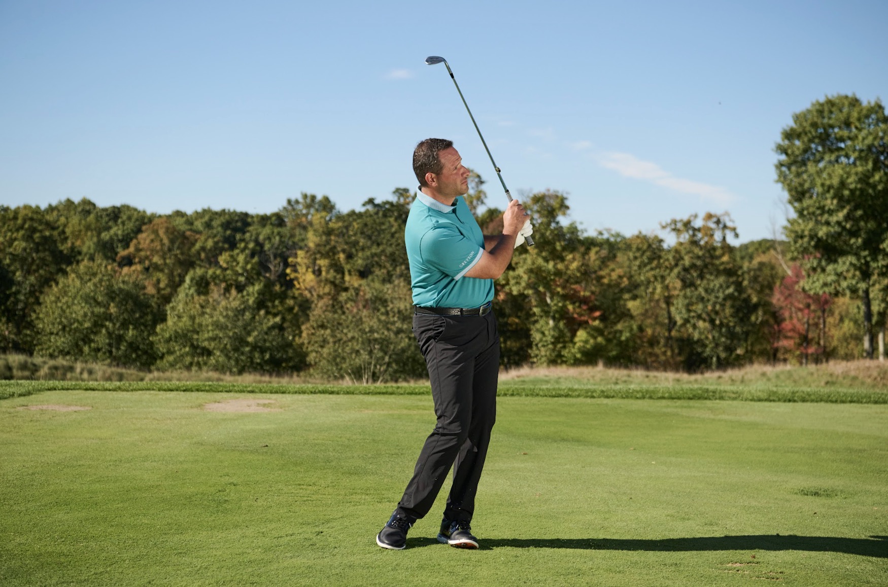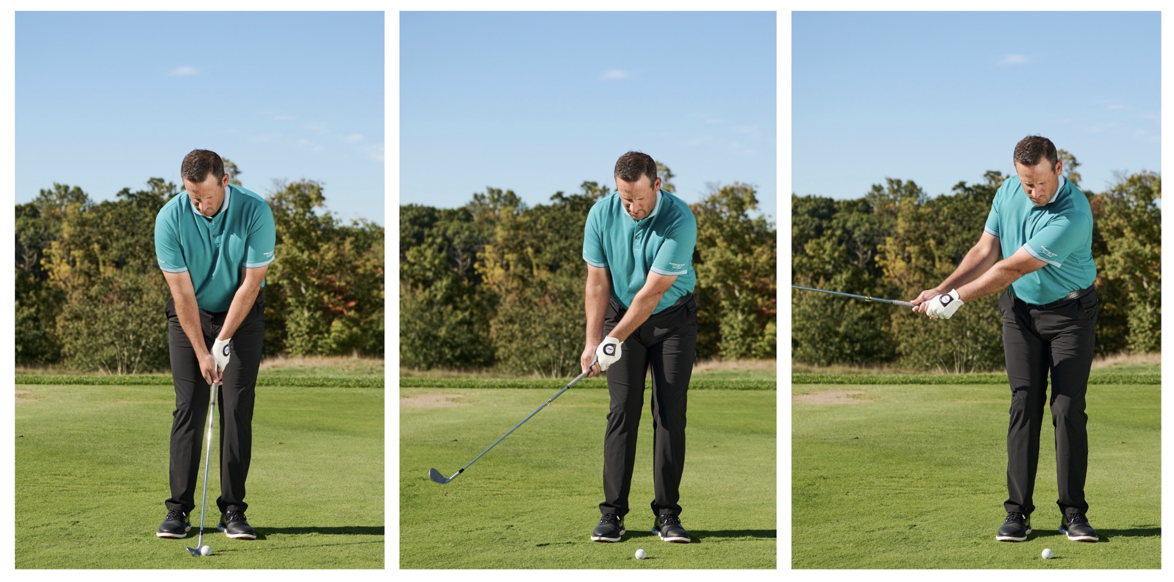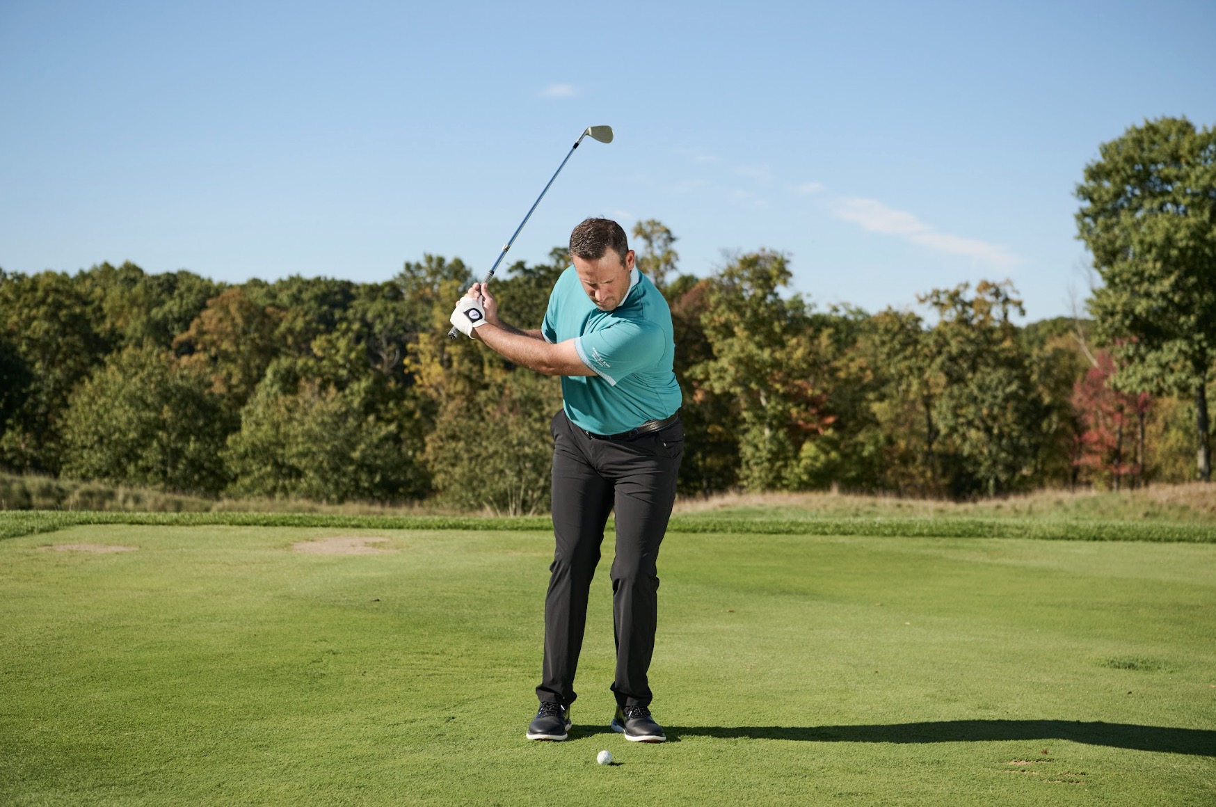 Thay vào đó, hãy đứng rộng hơn một chút, mở nhẹ mặt gậy và thân người so với đường ngắm. Dồn trọng tâm nhẹ về chân trước và đặt bóng hơi tiến lên, gần chân trước – gần giống như khi bạn đánh gậy gỗ fairway. Khi bắt đầu backswing, hãy gập cổ tay sớm, đưa gậy ra sau xa hơn so với cú pitch thông thường. Tư thế của bạn nên trông như thế này (như hình).