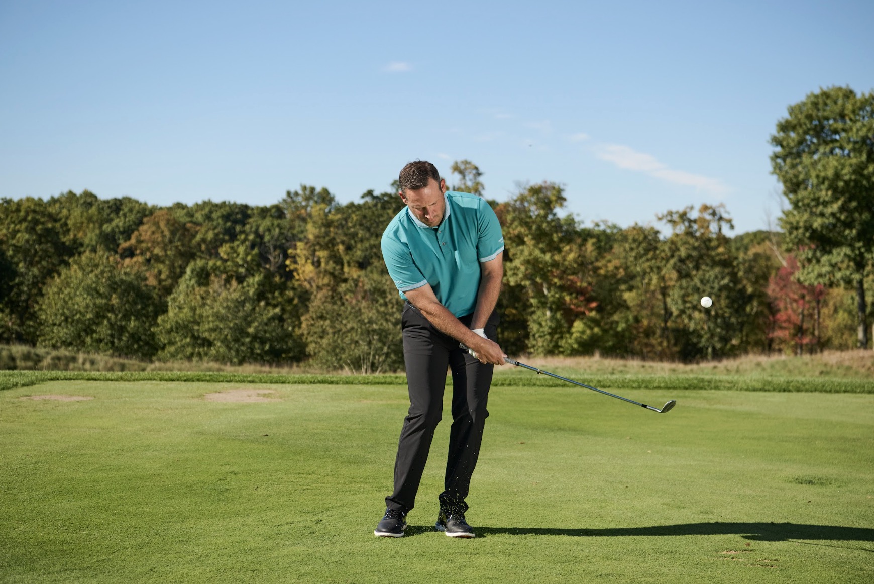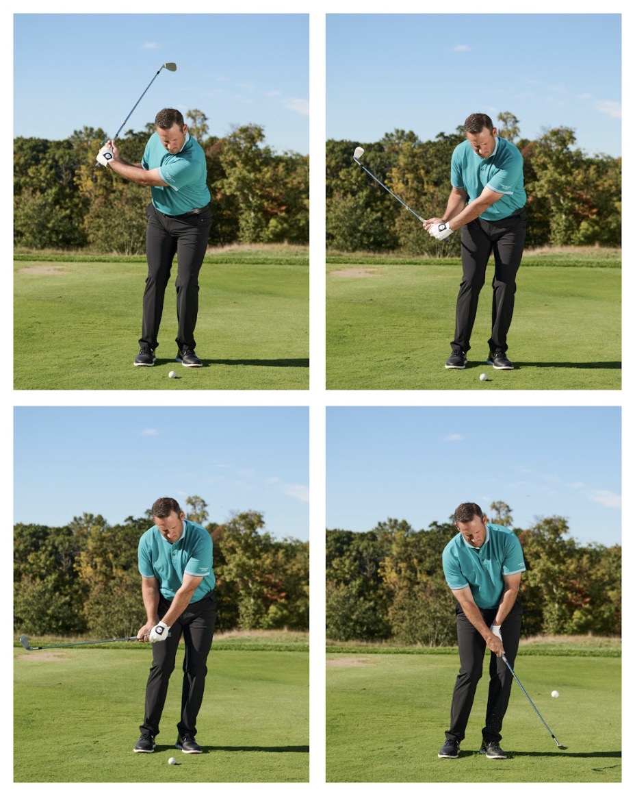 Lúc này, bạn đã sẵn sàng tạo tốc độ và độ mở để “bật” bóng lên. Trong downswing, đây là một trong số ít cú đánh golf mà bạn nên cảm thấy như đang “ném” gậy vào bóng. Cụ thể là bạn cần cảm giác cổ tay mềm và thả lỏng, để trọng lượng đầu gậy được giải phóng và di chuyển nhanh qua điểm chạm bóng (như hình).