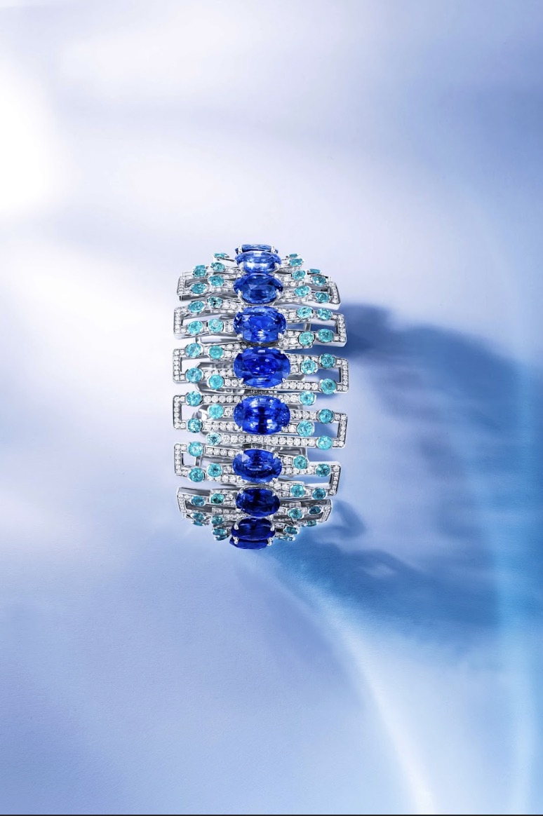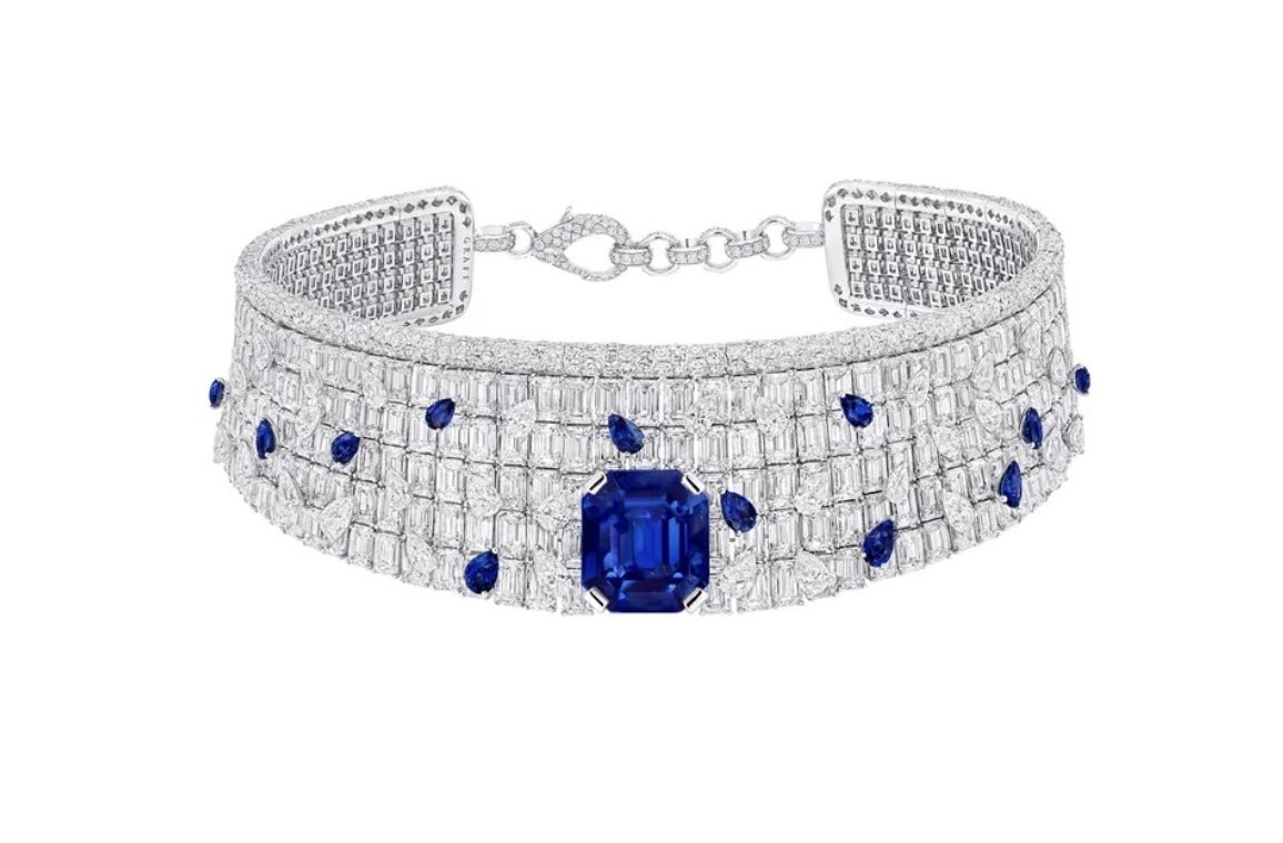 Graff’s latest high jewellery suite drew inspiration from the fluid beauty of water. An exceptional choker showcases a 31-carat sapphire set against emerald-cut white diamonds, with pear-shaped diamonds and sapphires radiating outward like ripples. Matching earrings cascade with diamonds and sapphires in fluid white-gold settings. In total, the suite features more than 200 carats of Graff diamonds, arranged with the brand’s signature precision.