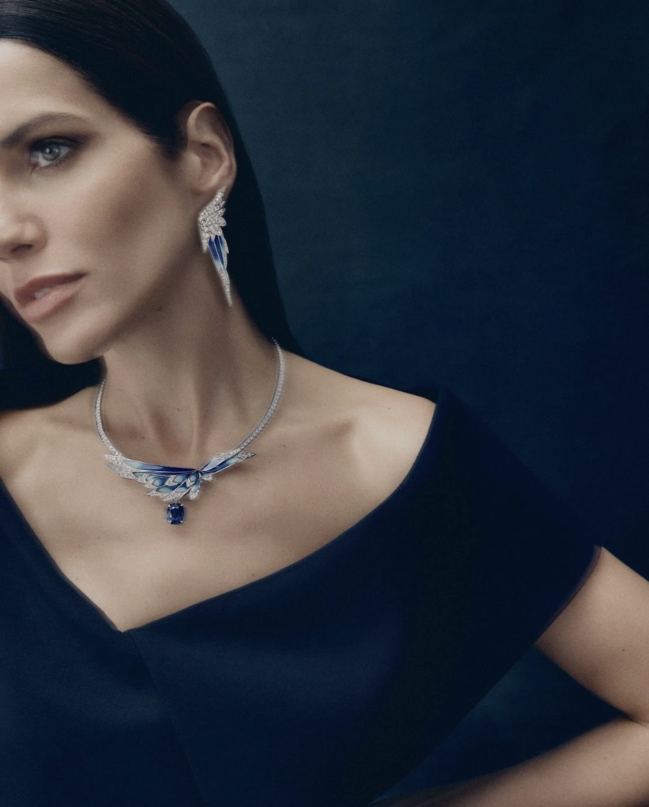 Heritage took flight at Chaumet with Envol, a collection inspired by a winged tiara purchased in 1910 by Gertrude Payne Whitney. The historic piece’s detachable wings informed a modern series of transformable jewels adorned with diamonds and grand feu enamel. A standout aigrette tiara, crafted over 850 hours, can be reconfigured into multiple headpieces, a bejewelled mask, or brooches. Elsewhere, earrings and rings feature removable jackets, while a statement necklace allows its central 10.96-carat sapphire to detach and transform into a brooch.
