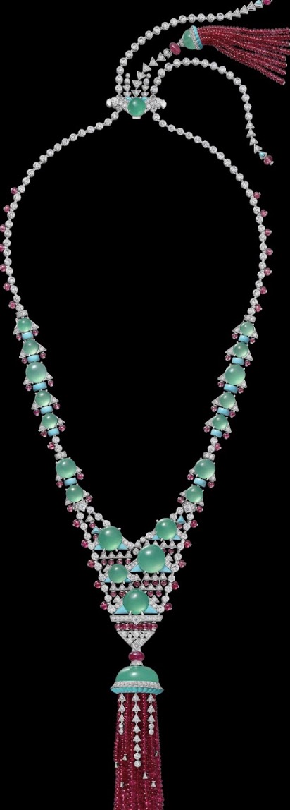 Cartier unveiled its latest En Équilibre high jewellery creations at the Maison’s Rue de la Paix boutique, placing contemporary designs alongside historic masterpieces to striking effect. This dialogue between past and present was reflected in modern pieces such as the Ephonia necklace, with its architectural diamond-and-ruby pendant, and the Ondora necklace, where rounded chrysoprase cabochons meet vivid red spinel beads. A jewel-set “Tiny Tutti Frutti” bracelet watch echoed the vibrant palette of Cartier’s 1929 Tutti Frutti clips, reaffirming the Maison’s enduring mastery of colour.