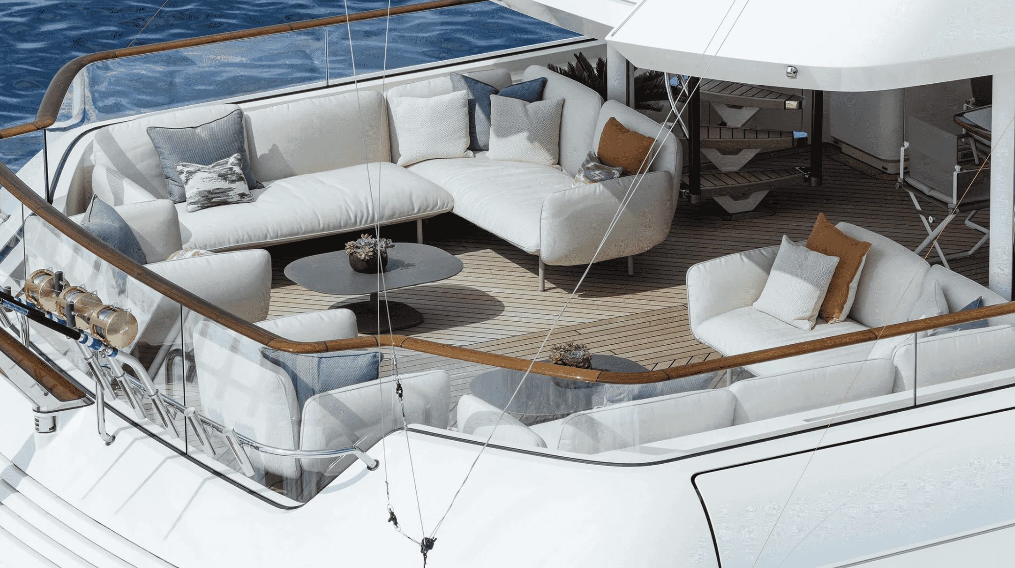 Step inside and the atmosphere shifts. Rather than dazzle with ostentation, the interiors envelop with calm. Walnut joinery, neutral fabrics, and clean lines create an aesthetic that is sophisticated yet warm. The choice is deliberate: this is a yacht meant to be lived in, not simply admired. Multiple salons flow seamlessly across decks, offering spaces for family dinners, quiet reading, or festive gatherings. Six outdoor venues and three indoor decks mean there is always somewhere new to discover, whether in the glow of sunrise or beneath a canopy of stars. Even practical elements are executed with quiet elegance, as in the glass-enclosed elevator that links three decks—functional, discreet, and graceful.