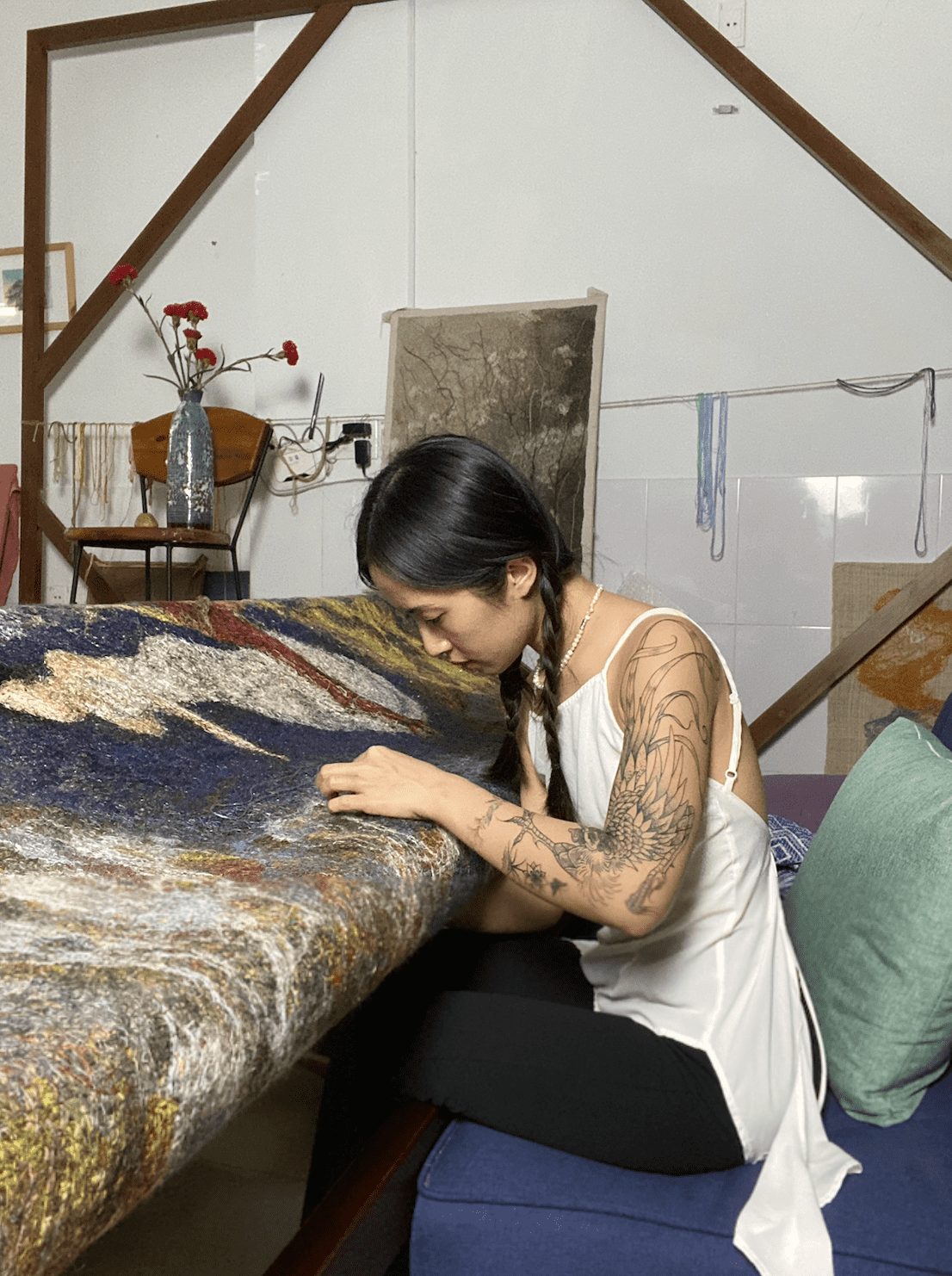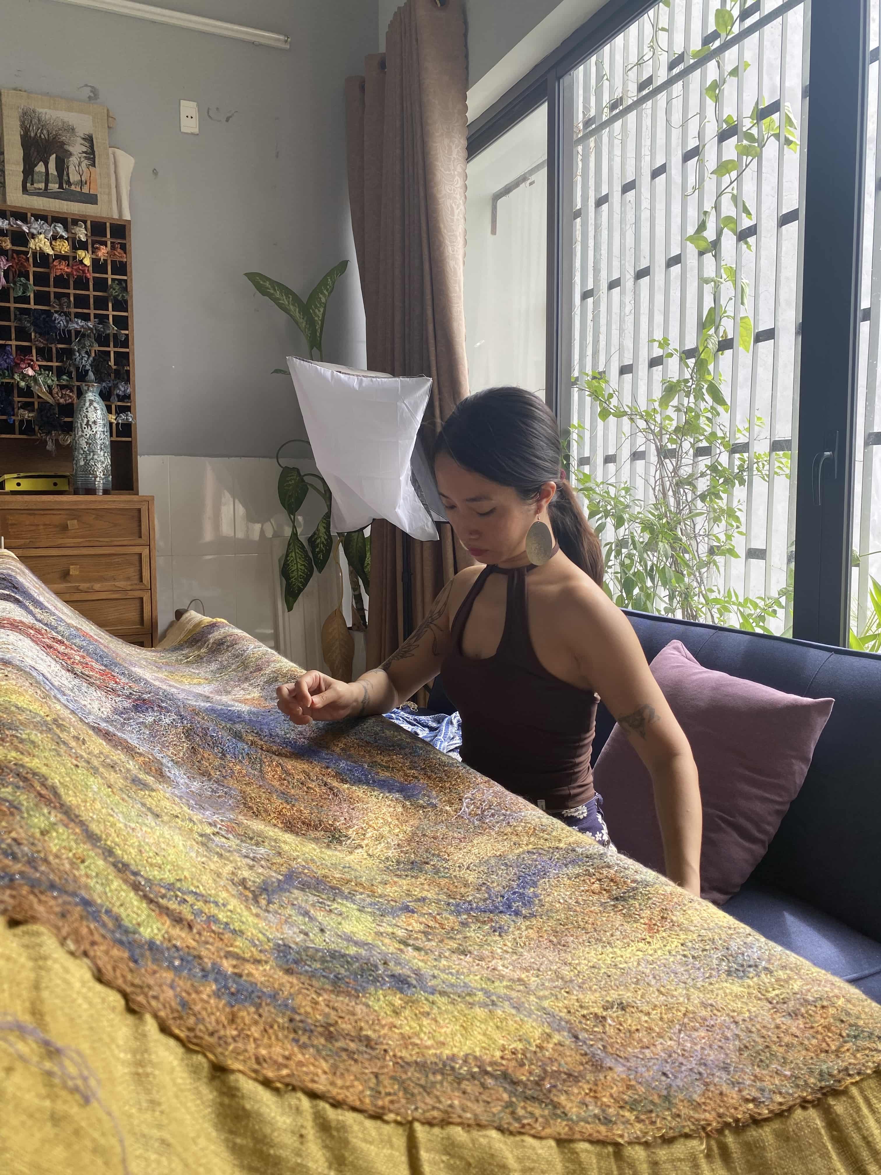 Việc gắn bó với từng dải sợi, từ việc chọn từng màu sắc cho đến bước cuối cùng để hoàn thiện tác phẩm là một hành trình không ngừng học hỏi và sáng tạo. Nếu ai đó hỏi điều gì khiến cô bị thu hút bởi chất liệu này đến vậy, có lẽ là bởi trong sợi tồn tại một thứ ngôn ngữ rất riêng – vừa mềm mại, bền bỉ, vừa dịu dàng mà cũng kiên định. Dưới bàn tay cô, sợi trở thành chất liệu được nâng niu, trở thành từng mảnh màu cảm xúc, là thứ giúp cô tự khắc họa nên chân dung của chính mình.