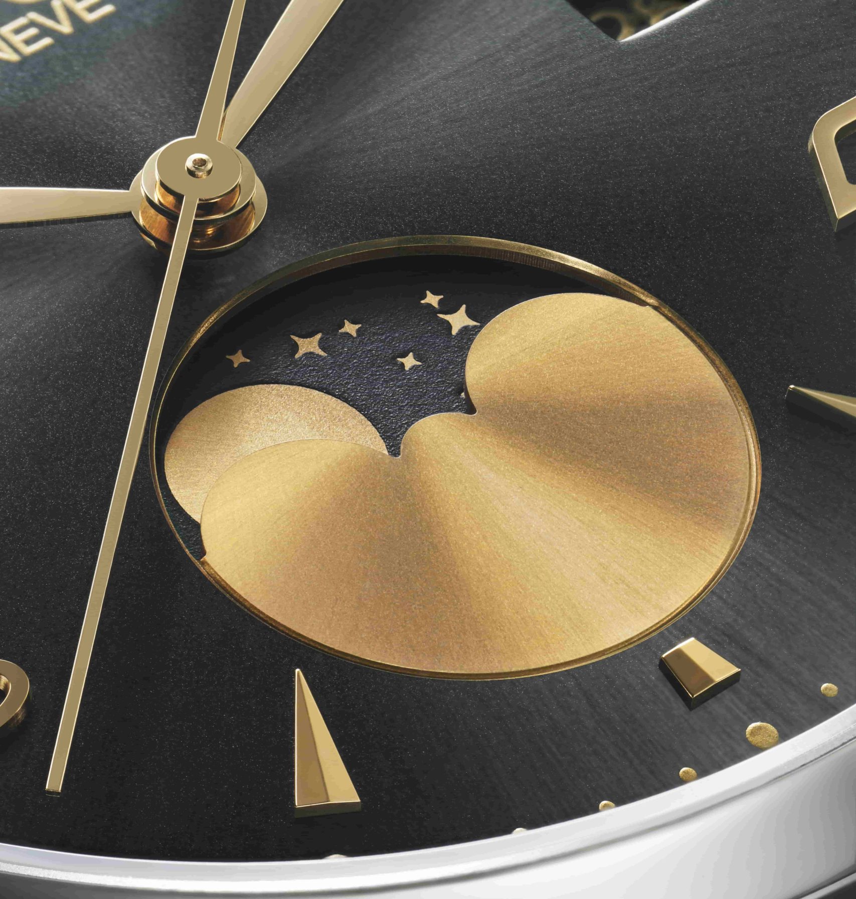 Cửa sổ lịch tuần trăng trên mỗi mặt số đều mang nét riêng, nhưng ý tưởng của Jay dành cho phiên bản mặt số màu champagne thực sự cuốn hút. Đĩa trăng vàng ánh bạc huyền ảo tượng trưng cho mặt trăng ẩn sau mảng cắt đen thẳm, dần hiện ra rồi lại khuất đi theo chu kỳ tròn – khuyết của trăng.