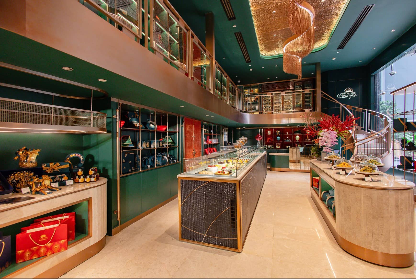 Khung cửa chính hình vòm, dẫn lối vào khu vực bày trí các bộ sưu tập quà tặng sang trọng, sản phẩm thủ công địa phương và nhiều loại bánh đặc sắc, mời gọi quý khách đến trải nghiệm và thưởng lãm. Chất liệu đồng được sử dụng xuyên suốt từ khung cửa, lan can, đến hệ tủ trưng bày và trang trí, kết hợp cùng các mảng kính trong và kính gân, tạo nên cấu trúc thị giác nhiều lớp, sang trọng và thoáng đạt. Hệ thống đèn LED ẩn theo các đường cong kiến trúc, phản chiếu ánh sáng tinh tế lên bề mặt kim loại, đem đến cảm giác ấm áp. Các quầy trưng bày với chất liệu đá cẩm thạch và hoa văn hình học tinh giản, tạo cảm giác vững chãi, cân bằng hài hòa giữa thẩm mỹ và công năng.