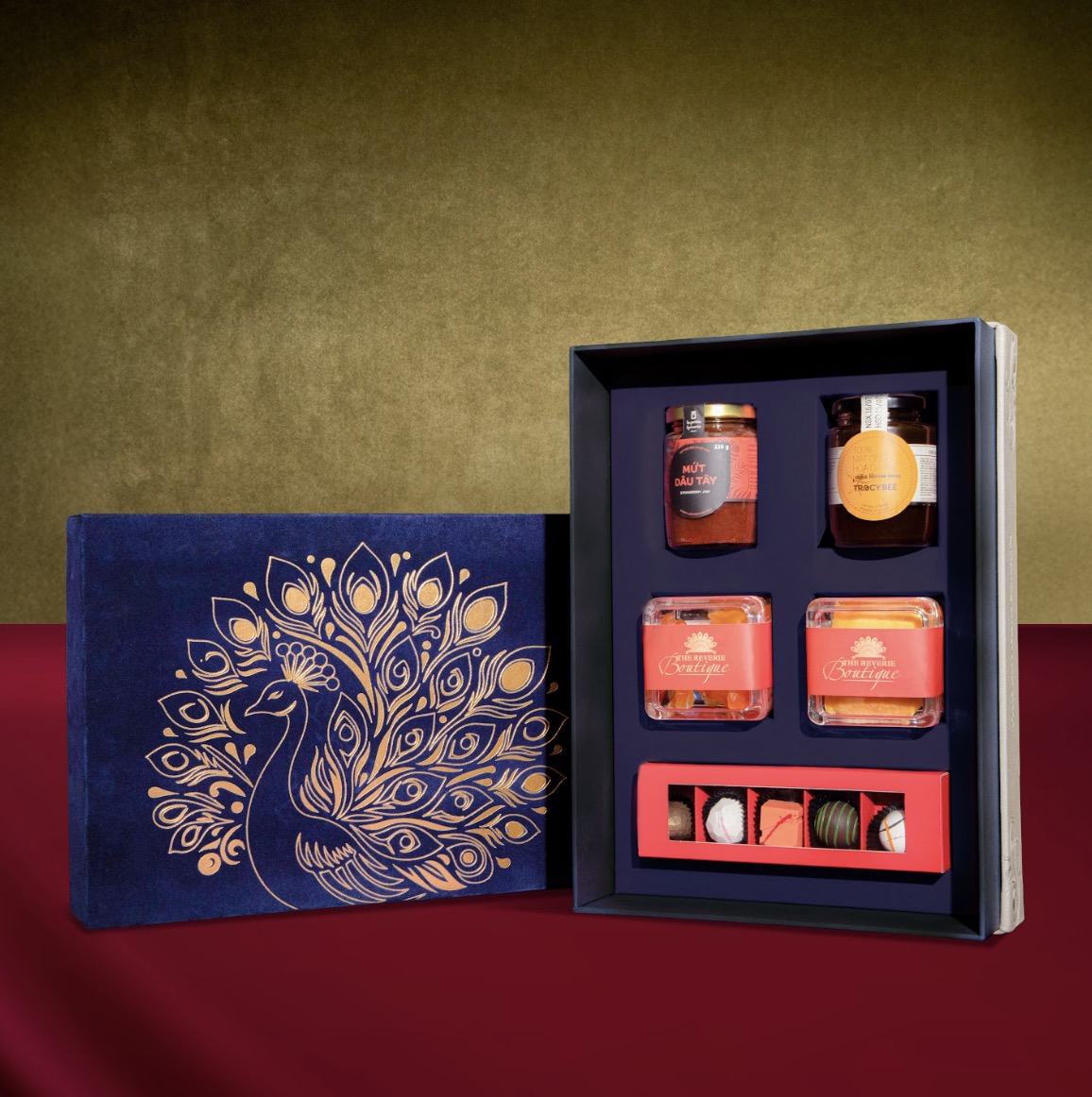 - Hộp “Kim Bảo Lam Ngọc”: giá 1,388,000 VNĐ+/ hộp, bao gồm sô-cô-la, mật ong hoa cà phê, mứt dâu, đu đủ sấy, và xoài sấy.