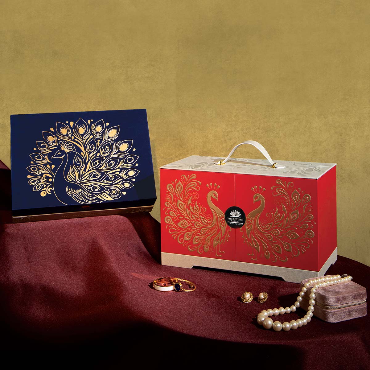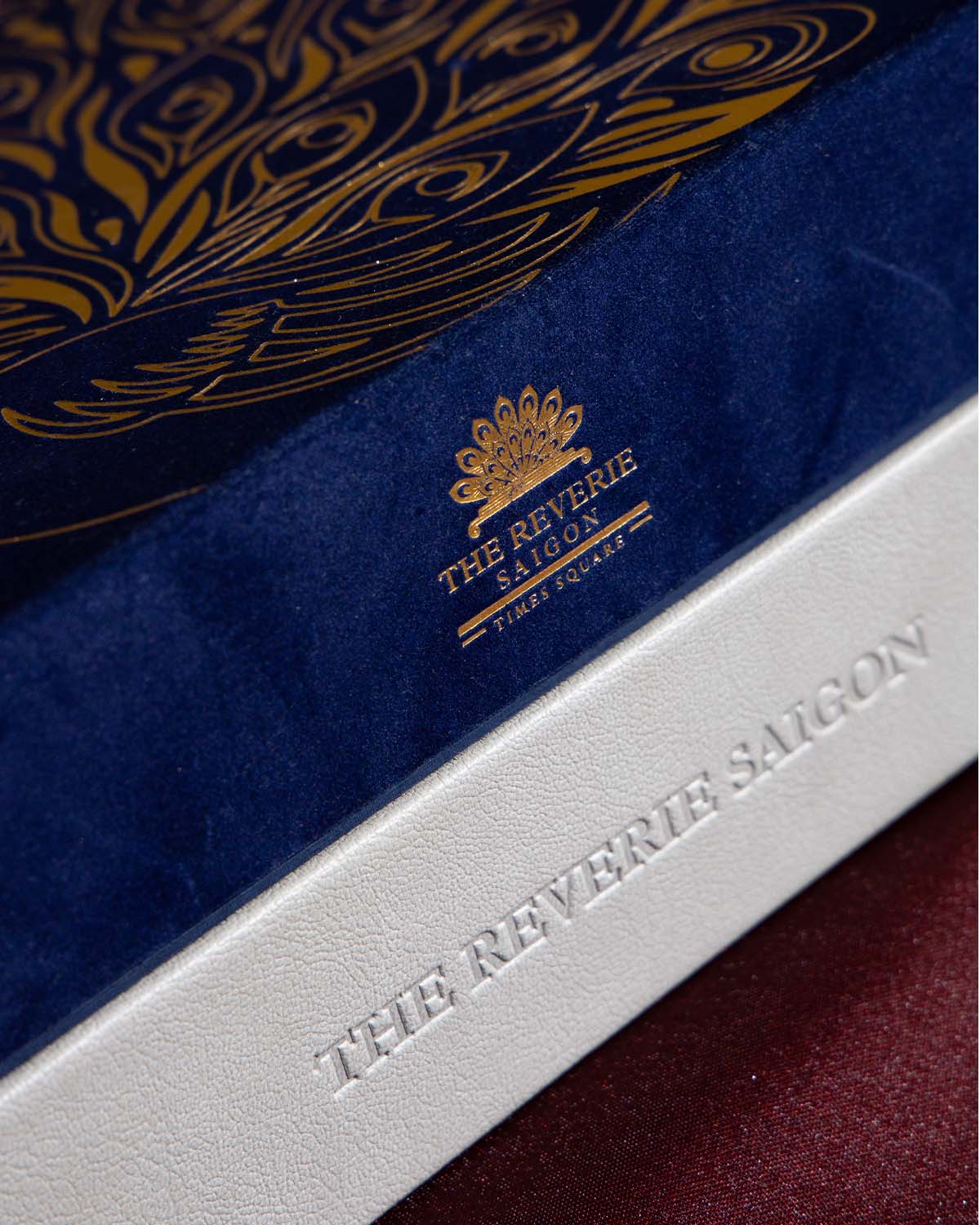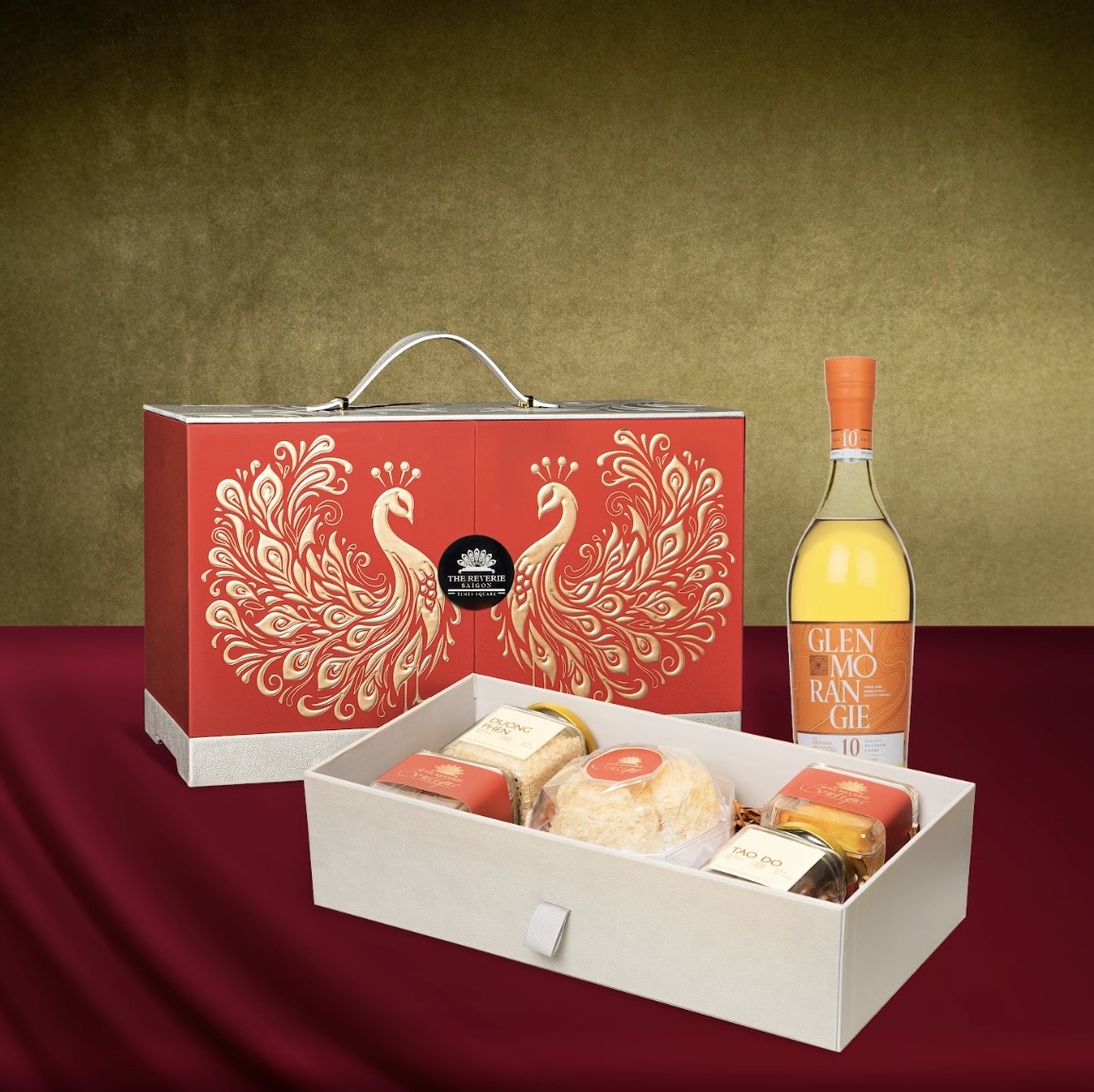 Hộp quà “Kim Bảo Phú Quý” sử dụng chất liệu da cao cấp với các họa tiết dập chìm, cùng điểm nhấn là đôi khổng tước ánh kim nổi bật trên nền nhung đỏ mềm mại, tạo nên tổng thể vừa sang trọng vừa độc bản. Hộp quà hai tầng bao gồm rượu Glenmorangie hoặc vang sủi (Prosecco), tổ yến và mứt trái cây cao cấp. Mỗi hộp quà là lời chúc khai xuân cát tường, phúc lộc thịnh vượng mà The Reverie Saigon gửi gắm đến những khách hàng trân quý.