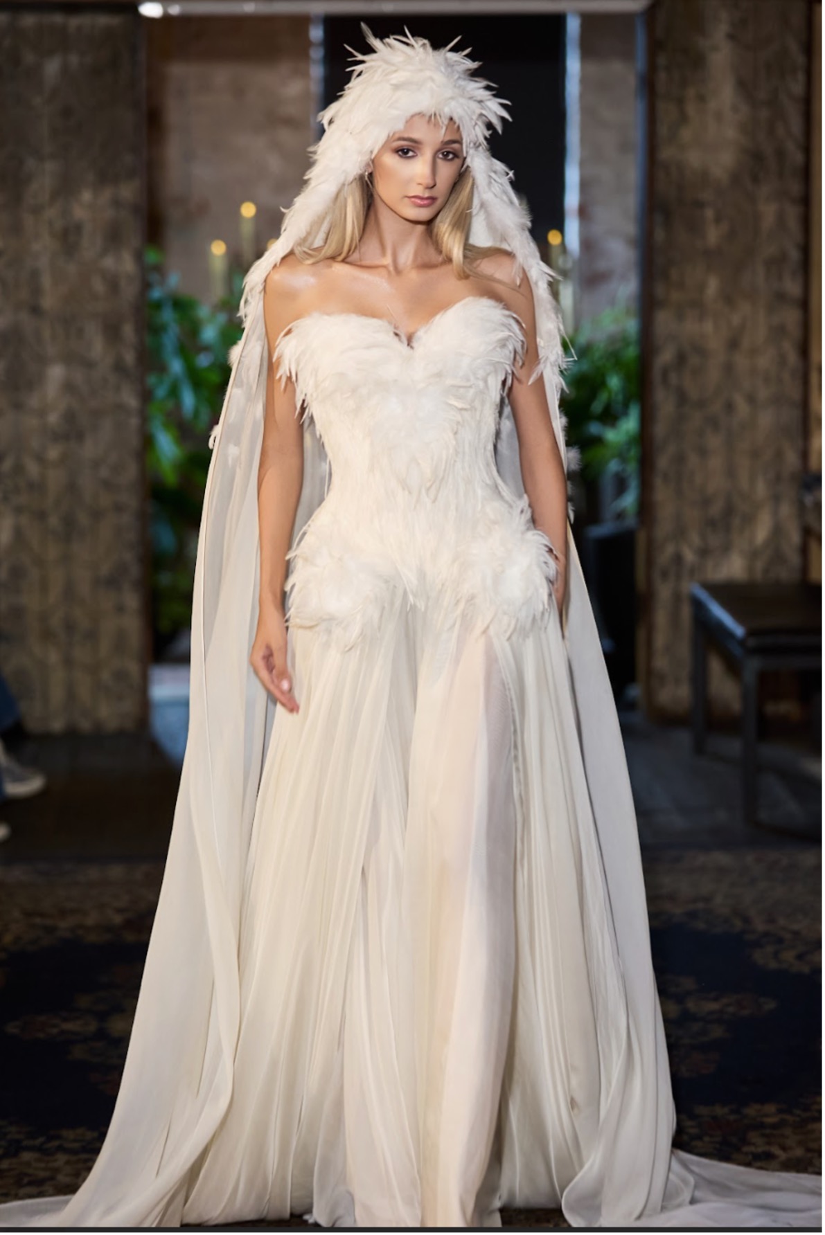 Thiết kế đầm WINGS OF HOPE được phủ đầy lông vũ tinh khôi – mềm mại, bay bổng, như biểu trưng cho khát vọng tự do và ý chí vươn xa mạnh mẽ.