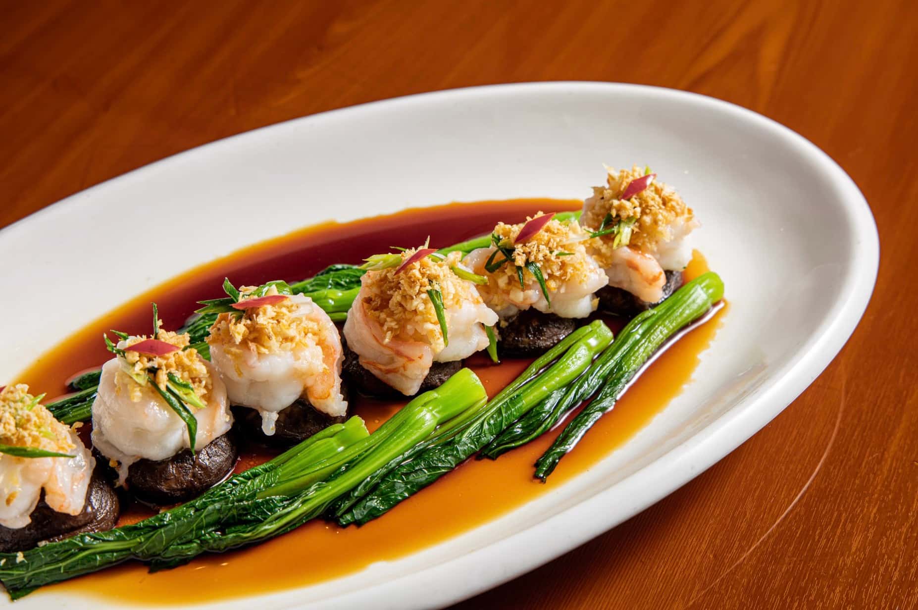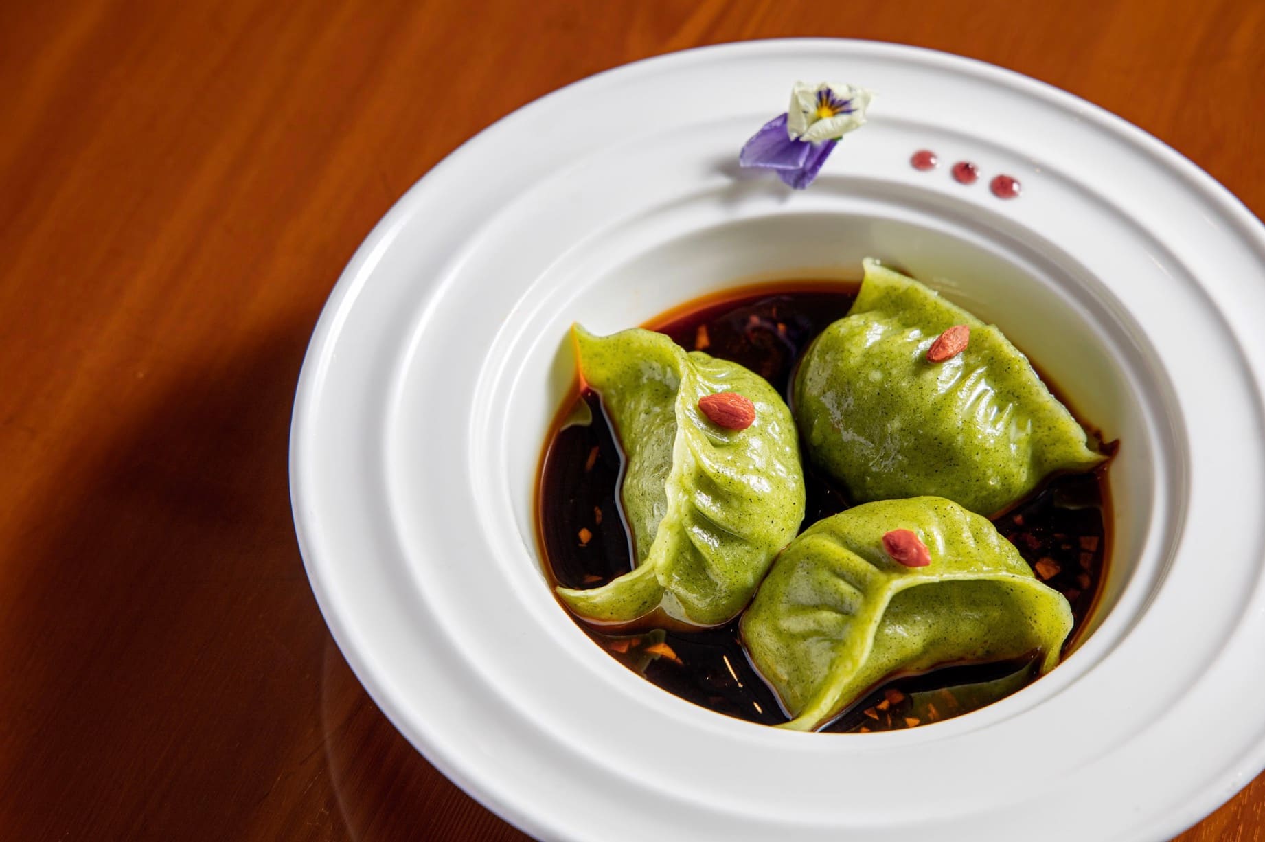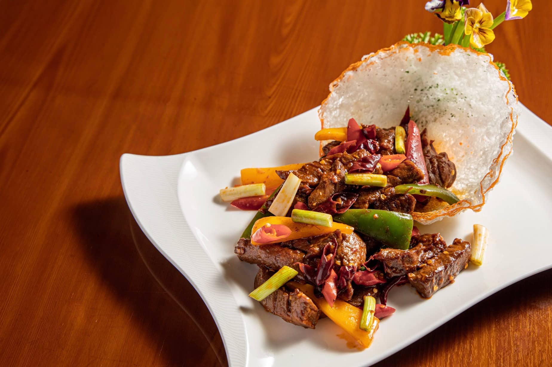 Mở đầu bản hòa âm vị giác là những nốt cao ấn tượng từ Bò xào Tứ Xuyên và Bánh xếp bích lục nhân tôm thịt sốt cay. Gây ấn tượng bởi sự kết hợp giữa những lát thịt bò Úc mềm mọng và nước sốt đặc trưng, món Bò xào Tứ Xuyên mang đến vị cay nồng được điều tiết khéo léo, vừa đủ để đánh thức vị giác mà vẫn giữ trọn độ ngọt tự nhiên của nguyên liệu. Tiếp nối nhịp điệu ấy, món Bánh xếp bích lục với lớp vỏ xanh bắt mắt bao bọc phần nhân tôm thịt chắc ngọt, được tẩm ướp vừa vị và thấm đượm lớp sốt cay tinh tế, tạo nên một tổng thể đậm đà đầy mới mẻ.