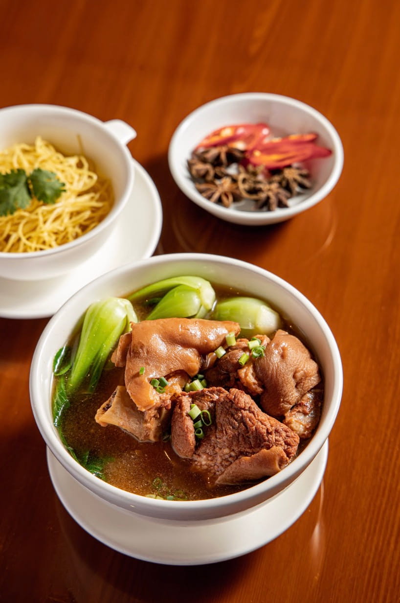 Hành trình thưởng thức hương vị được dẫn dắt qua những cung bậc sâu lắng hơn với Hủ tiếu mì giò heo nấu chao và Tôm hấp đông cô tỏi thơm. Sử dụng loại chao đỏ đặc biệt, nước dùng mang hương vị béo bùi thấm đượm trong từng sợi hủ tiếu mềm và mì tươi dai ngon, kết hợp cùng phần giò heo hầm mềm tạo nên dấu ấn thân thuộc cho bữa ăn gia đình. Song hành cùng đó là món Tôm hấp đông cô tỏi thơm – minh chứng cho sự tỉ mỉ qua kỹ thuật hấp chuẩn xác từ đội ngũ đầu bếp. Phần tôm chắc thịt hòa quyện cùng tỏi tươi và tỏi phi, điểm xuyết vị ngọt thanh của nấm đông cô tươi, mang đến trải nghiệm hương vị Quảng Đông nguyên bản một cách trọn vẹn nhất.