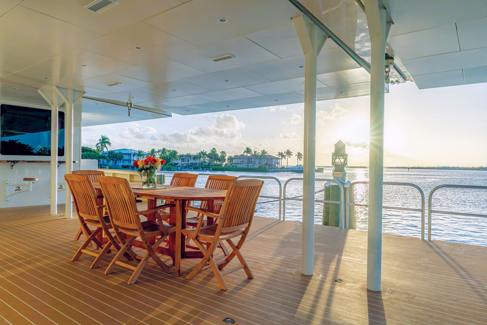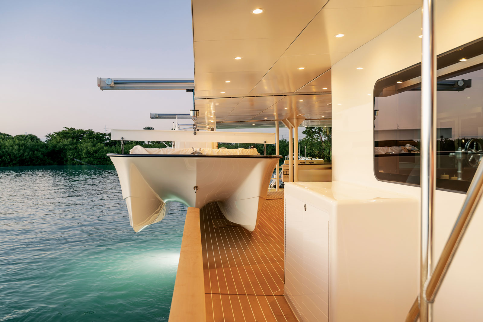 When all those toys are stowed, the aft deck opens up to become a roomy al fresco dining area. The novelty and complexity of these systems demanded ingenious solutions from naval architects and structural engineers, particularly to manage cantilever loads, crane footings, and retracting supports.