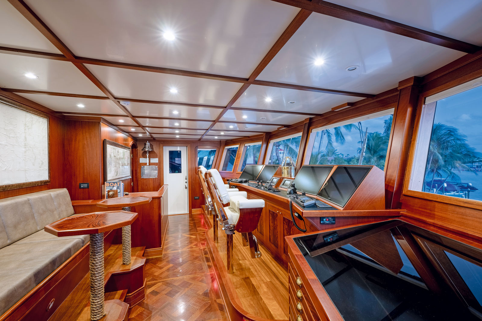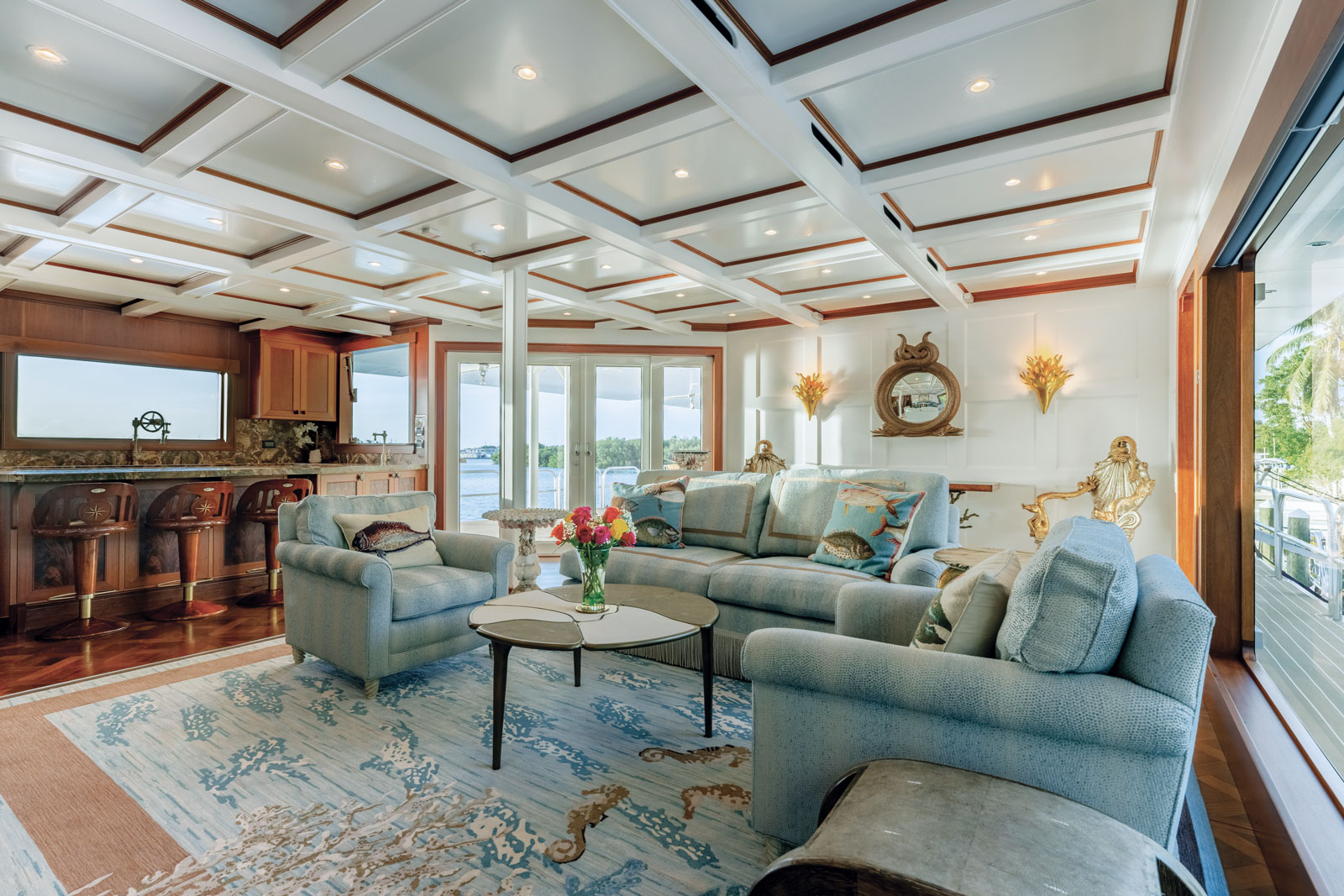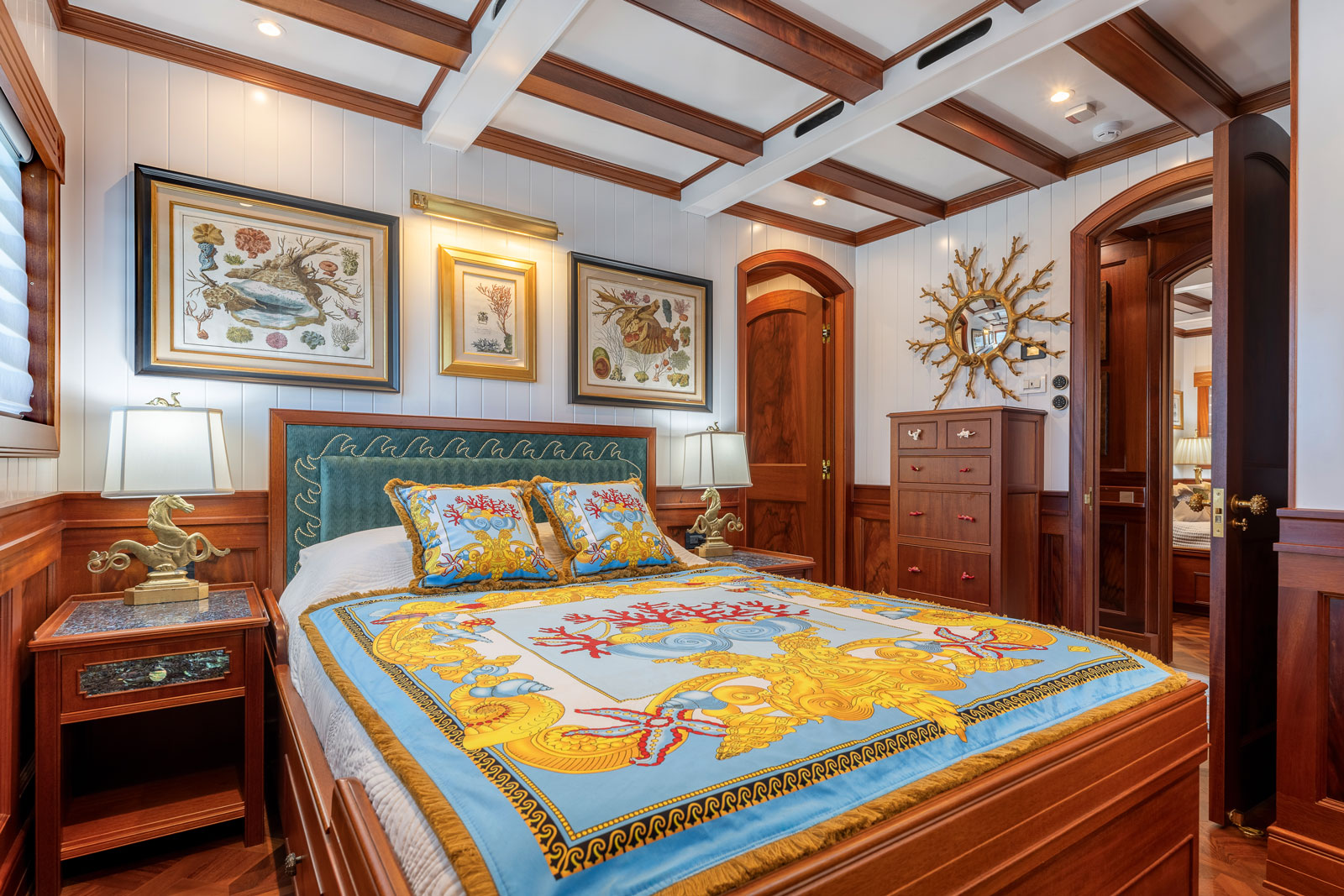 Schmitt and his team approached the interior as a treasure trove, reflecting his passion for collecting maps, antiquities, and natural artifacts. A 1719 map of the Western Hemisphere presides over the salon fireplace, and throughout the yacht one finds fossilized wood, Venetian grotto elements, and ornate objects curated from nautical decor sources. Each cabin is themed — whether around marine life, exploration, or coastal lore — with custom woodwork, mosaics, carved veneers, and bespoke hardware. The main guest deck houses three en suite queen staterooms, separated by a map-decorated corridor, while a private upper-deck owner’s suite includes a dramatic shower mosaic inspired by classic Greek sea motifs.