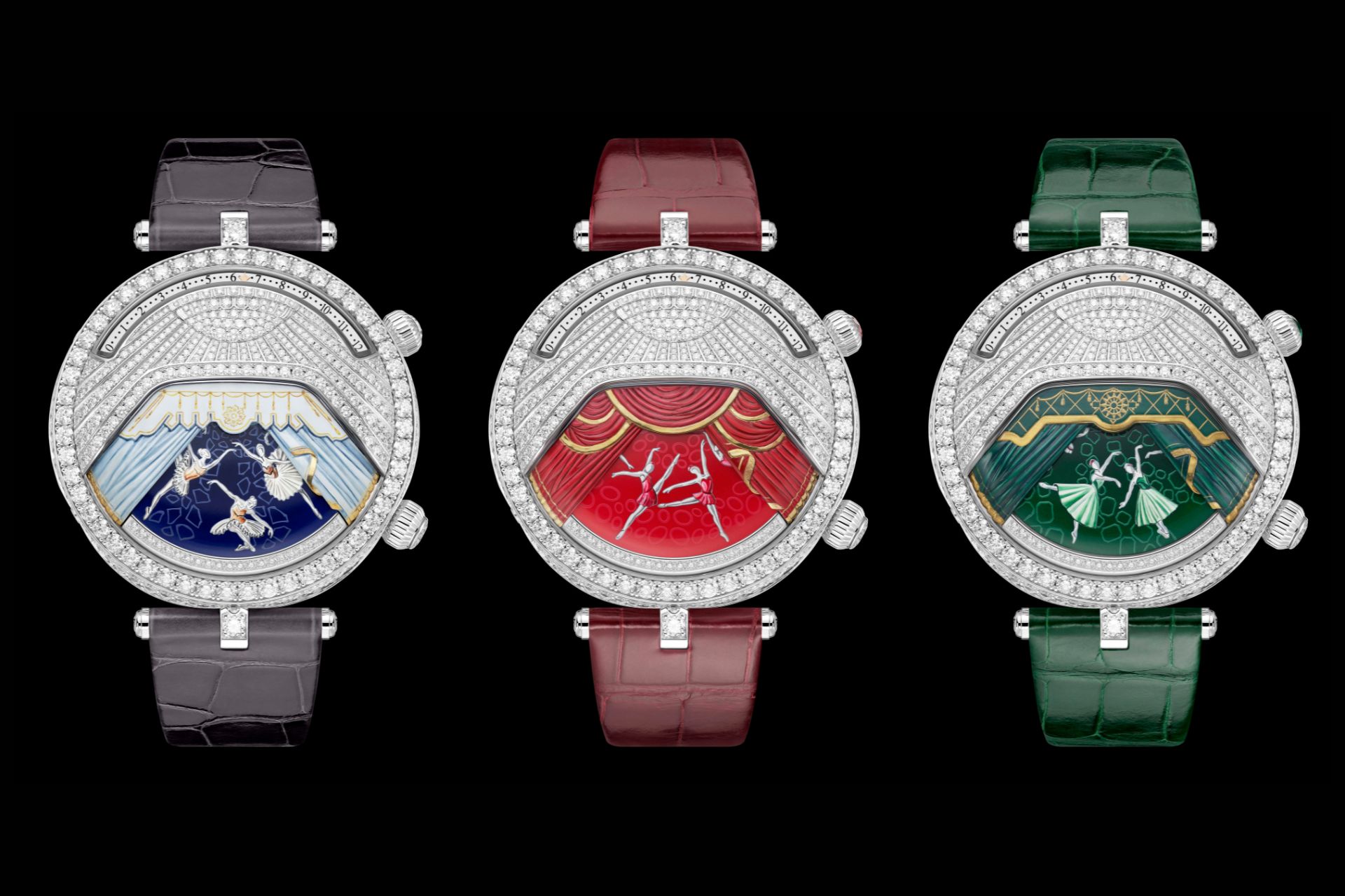 The maison also revisits its signature métiers d’art in this new collection. Enamel specialists, gem setters, and miniature painters work together to enhance the storytelling on each dial. Some pieces glow with diamonds while others feature soft washes of color that create a painterly atmosphere. The harmony between precise engineering and artistic technique reinforces the distinctive duality that defines the collection.